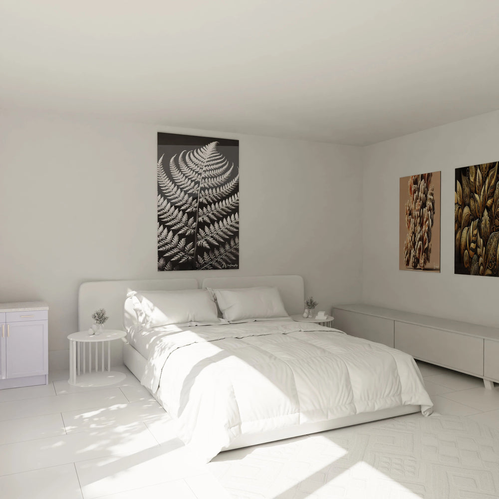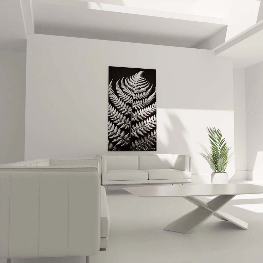 Au cœur de cette œuvre, la lumière caresse chaque feuille argentée, faisant ressortir les textures complexes et la symétrie parfaite qui caractérisent la nature. Les nuances de noir, gris et argent créent une ambiance mystérieuse, empreinte de profondeur et d’élégance intemporelle. Ce tableau transforme votre espace en une véritable alcôve de contemplation, où la lumière et l’ombre dansent avec douceur.