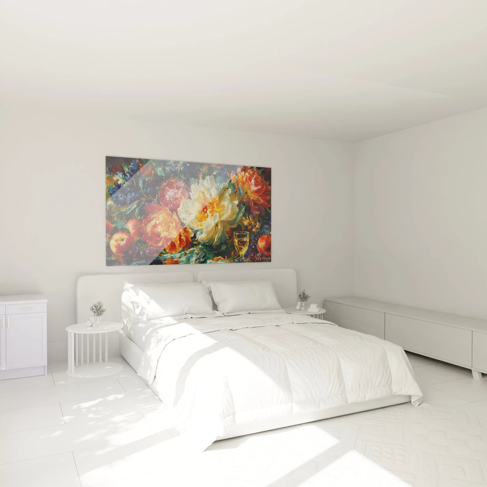 Cette œuvre représente un tableau nature morte d'une richesse visuelle exceptionnelle, où se mélangent harmonieusement pivoines somptueuses, fruits juteux et verre de cristal ambré. La composition révèle une maîtrise technique remarquable dans le rendu des textures florales et des reflets lumineux. Cette décoration murale nature morte baroque captive immédiatement par son explosion de couleurs chaudes et sa profondeur dramatique. Les détails minutieux des pétales et la brillance du verre créent un ensemble d'une sophistication rare, transformant cette œuvre en véritable joyau décoratif pour sublimer tout intérieur raffiné.