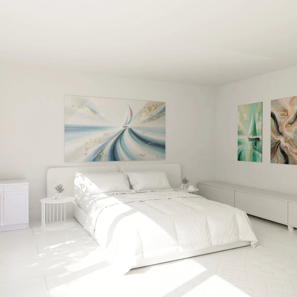 Le rendu, à la fois abstrait et réaliste, crée une harmonie visuelle qui invite votre regard à glisser sur la toile, comme porté par le vent et les vagues.