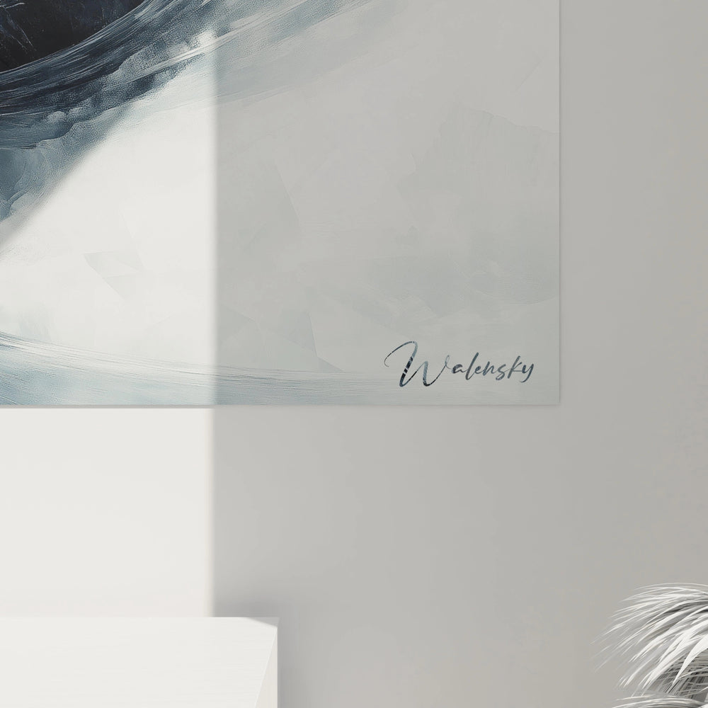 Les courbes fluides de ce tableau spirale abstrait monochrome évoquent à la fois les galaxies lointaines et les mouvements de l'eau, créant un pont visuel entre le macrocosme et le microcosme. L'œuvre se distingue par sa capacité à paraître en mouvement perpétuel, comme si la spirale continuait de tourner même lorsqu'on la contemple fixement.