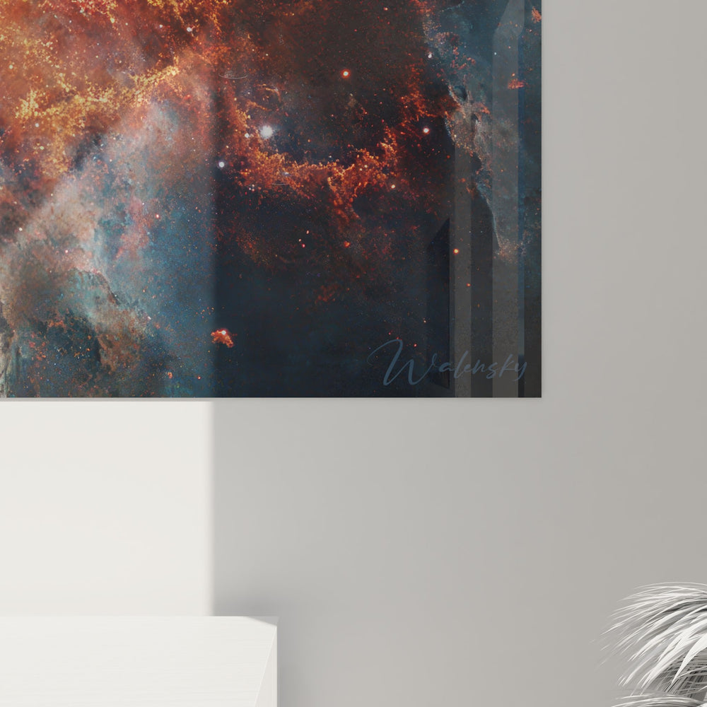 Ce tableau mural nébuleuse planétaire capture la beauté spectaculaire d'une explosion stellaire dans toute sa splendeur cosmique. L'œuvre présente une nébuleuse planétaire flamboyante au centre de la composition, formant un anneau de matière incandescente aux teintes dorées et orangées. Cette représentation astronomique artistique révèle les détails fascinants de ce phénomène spatial, avec ses filaments de gaz ionisé qui s'étendent dans l'obscurité de l'espace. Les couleurs chaudes dominantes - rouge, orange et jaune - contrastent magnifiquement avec les zones bleues et grises plus froides de la périphérie. Ce tableau espace moderne transforme un événement astronomique réel en une œuvre d'art murale saisissante. La structure en anneau de la nébuleuse, avec son cœur lumineux et ses extensions gazeuses, crée une composition équilibrée et harmonieuse. L'artiste a su retranscrire la majesté de l'univers profond en capturant les nuances subtiles de cette explosion cosmique. Cette décoration murale spatiale apporte une dimension scientifique et esthétique unique à tout intérieur, invitant à la contemplation de l'immensité cosmique.