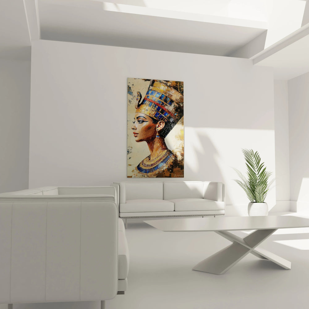 Ce tableau Néfertiti captive immédiatement par son portrait de profil majestueux de la célèbre reine d'Égypte. L'œuvre présente un visage aux traits fins et aristocratiques, orné d'une couronne traditionnelle égyptienne richement décorée. Le tableau Néfertiti style antique révèle une technique mixte sophistiquée alliant couleurs vives et textures rugueuses. La composition met en valeur le port altier de la souveraine, son regard dirigé vers l'horizon avec une expression de sérénité royale. Les ornements dorés et les bijoux traditionnels complètent cette décoration murale Néfertiti d'exception, créant une atmosphère à la fois mystique et raffinée qui évoque la grandeur de l'Égypte antique.
