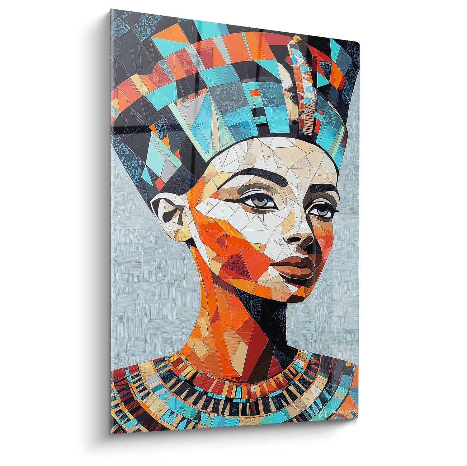 Ce tableau Néfertiti présente une interprétation moderne saisissante de la célèbre reine égyptienne. L'œuvre se distingue par sa technique de mosaïque géométrique qui transforme le portrait classique en une composition contemporaine vibrante. La décoration murale Néfertiti révèle immédiatement sa couronne iconique composée de fragments colorés en turquoise, orange et noir. Le visage de la souveraine émerge d'un assemblage de formes polygonales qui créent une harmonie entre tradition et modernité. Cette représentation unique du tableau Néfertiti géométrique capture l'essence royale tout en apportant une esthétique résolument actuelle.