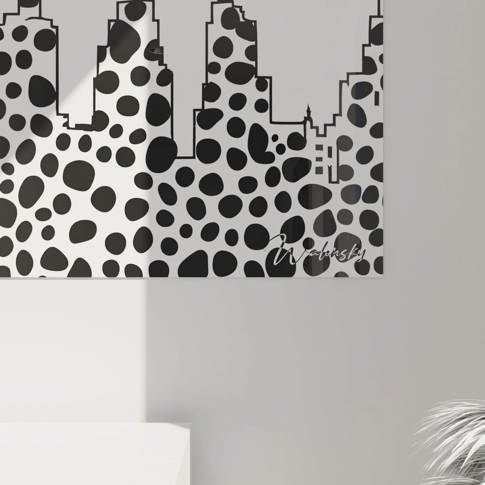 Chaque regard dévoile une nouvelle facette de ce tableau : d’abord la silhouette intense de la métropole, puis la danse des points tachetés qui évoquent un rythme presque hypnotique. Cette richesse visuelle joue avec la lumière, offrant une expérience sensorielle profonde, aussi bien reposante qu’énergisante. Le décor devient ainsi une galerie où art et vie se fondent en une harmonie parfaite.