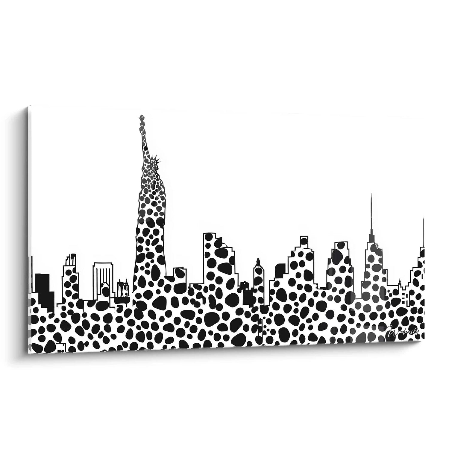 Ce tableau Manhattan tacheté présente une interprétation contemporaine saisissante du célèbre skyline new-yorkais. L'œuvre transforme l'iconique silhouette urbaine en une composition pointilliste révolutionnaire, où chaque gratte-ciel devient une structure organique parsemée de cercles noirs de tailles variées. Cette décoration murale Manhattan moderne capture l'essence dynamique de la métropole à travers un prisme artistique minimaliste. L'Empire State Building se dresse majestueusement au centre, reconnaissable par sa forme élancée caractéristique, tandis que les autres buildings s'étalent harmonieusement sur l'horizon. Le tableau Manhattan pointilliste noir et blanc révèle immédiatement son caractère unique par cette technique de fragmentation visuelle qui évoque autant les cellules biologiques que les bulles urbaines.