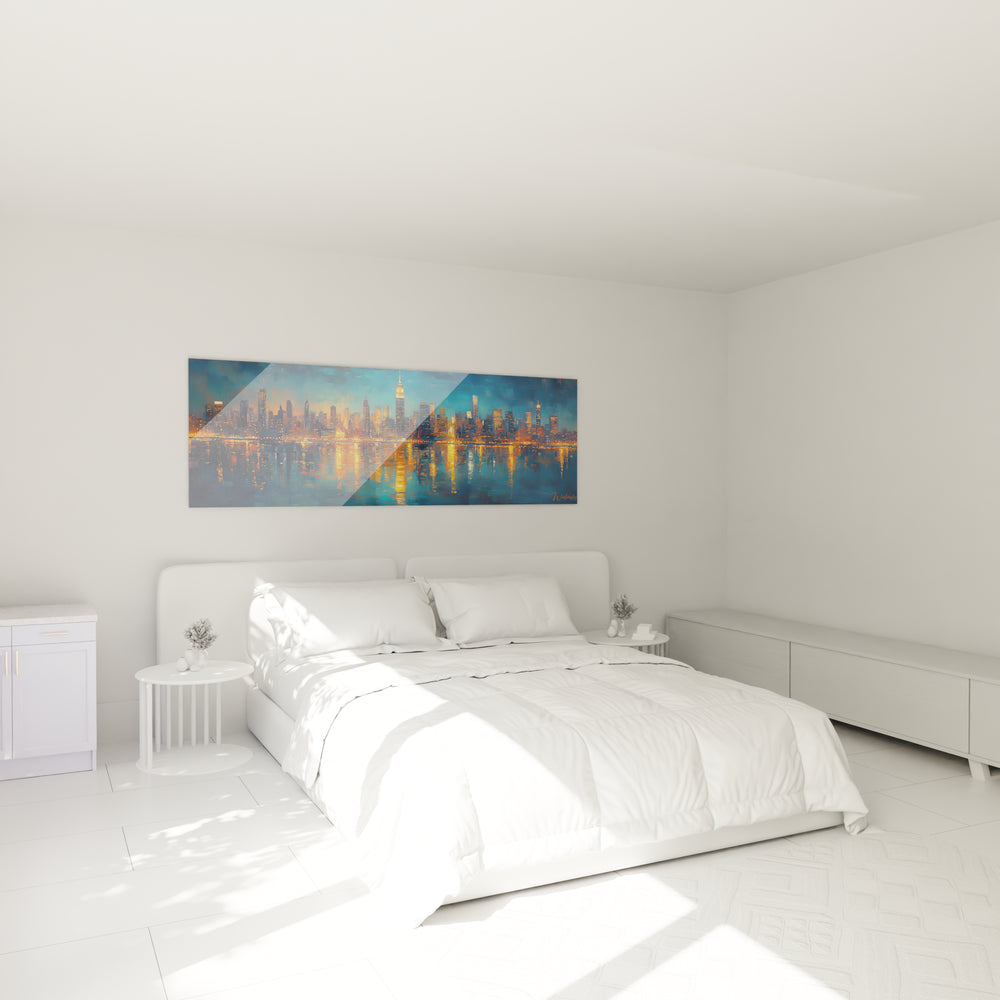 Cette art mural New York trouve sa place idéale dans des espaces contemporains où son format panoramique peut être pleinement apprécié. Un éclairage LED indirect mettra parfaitement en valeur les tons dorés et bleus de l'œuvre, créant une ambiance sophistiquée. Les environnements aux tons neutres - blancs, gris ou beiges - permettront aux couleurs du tableau de ressortir magnifiquement sans concurrence visuelle. Un salon moderne, un bureau exécutif ou une chambre à coucher contemporaine constituent des écrins parfaits pour cette décoration murale. L'association avec du mobilier aux lignes épurées et des matériaux comme le métal brossé ou le verre complétera harmonieusement l'esthétique urbaine de ce tableau New York. La hauteur de placement doit permettre une vision confortable des détails tout en préservant l'impact visuel de l'ensemble panoramique.