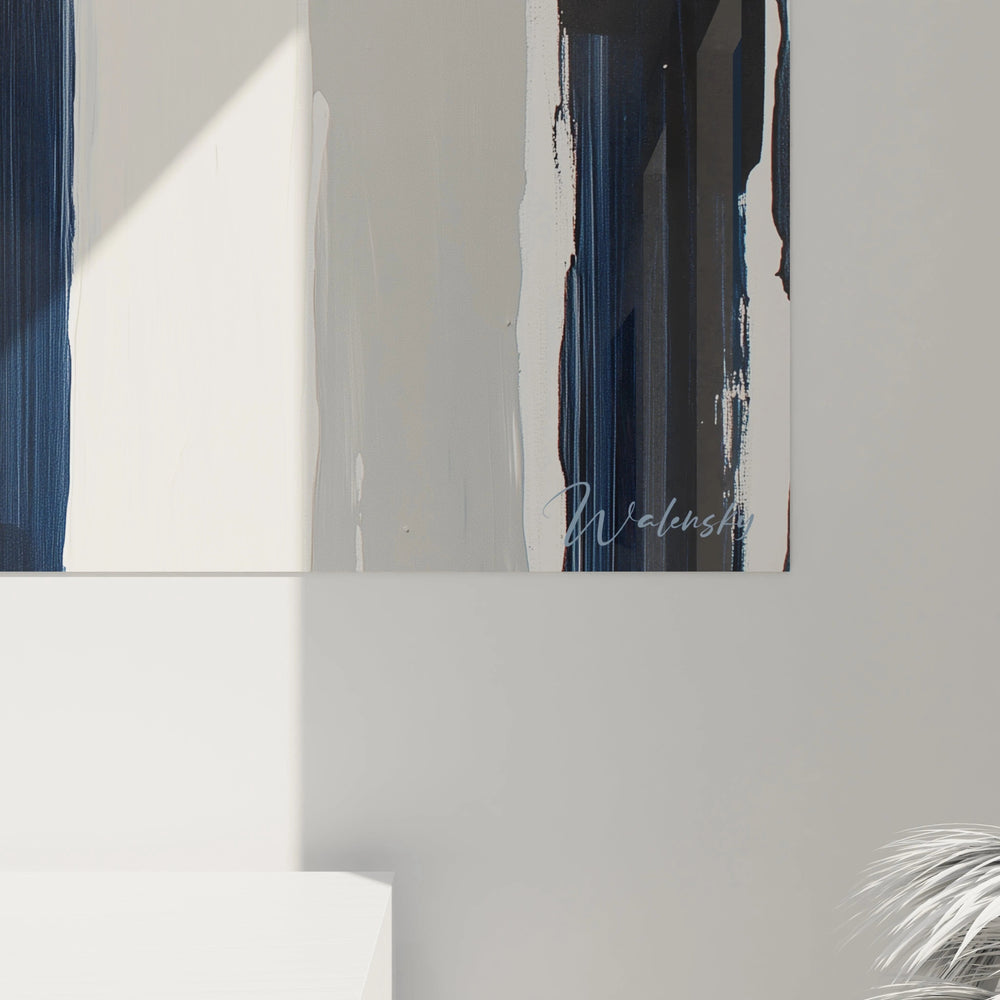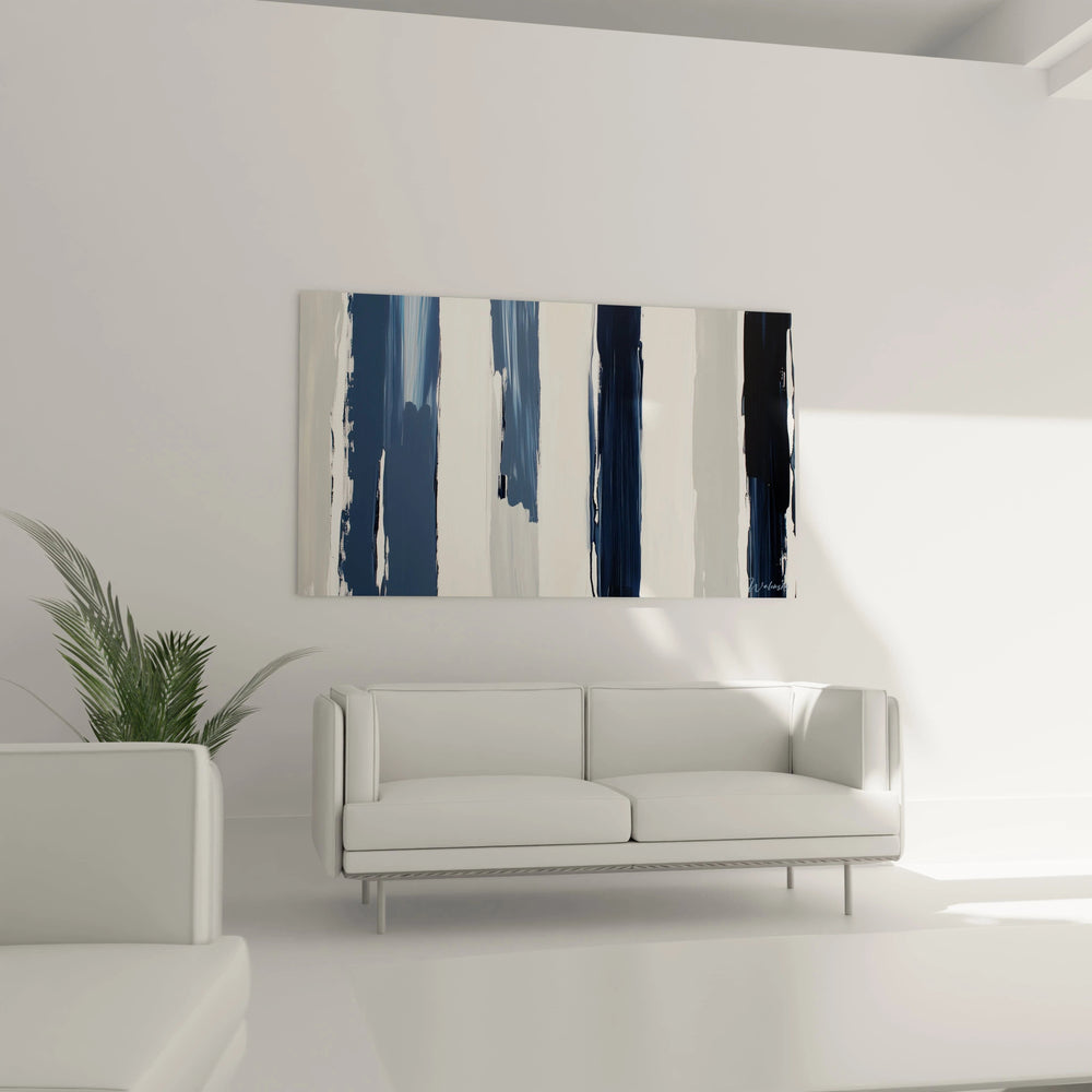 Ce tableau abstrait rayures verticales présente une composition contemporaine saisissante qui capture immédiatement l'attention par son jeu de bandes verticales alternées. Cette œuvre d'art moderne révèle une harmonie parfaite entre les tons froids et neutres, créant une atmosphère apaisante et sophistiquée. Le tableau abstrait moderne bleu gris se distingue par ses lignes droites impeccables et sa palette chromatique délicatement équilibrée. Les variations de largeur entre les bandes créent un rythme visuel captivant qui évoque la musicalité et le mouvement. Cette décoration murale abstraite contemporaine transforme instantanément l'ambiance d'un espace grâce à son élégance minimaliste et sa présence magnétique.