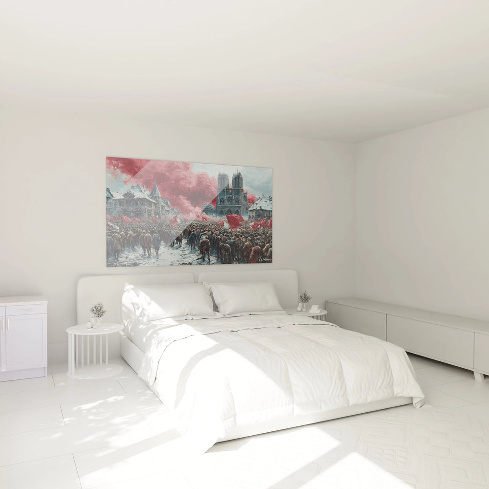 Ce tableau Notre-Dame révèle une vision saisissante de la célèbre cathédrale parisienne dans un contexte révolutionnaire dramatique. L'œuvre présente Notre-Dame de Paris dominant majestueusement un paysage urbain enneigé, tandis qu'une foule immense se rassemble devant ses tours gothiques iconiques. Le tableau Notre-Dame révolutionnaire capture un moment historique intense avec des drapeaux rouges flottant au-dessus de la multitude. Les tours de la cathédrale se dressent avec une prestance architecturale remarquable, leurs détails gothiques finement ciselés contrastant avec l'agitation populaire. Cette décoration murale Notre-Dame transforme l'espace par sa puissance évocatrice et son réalisme saisissant.