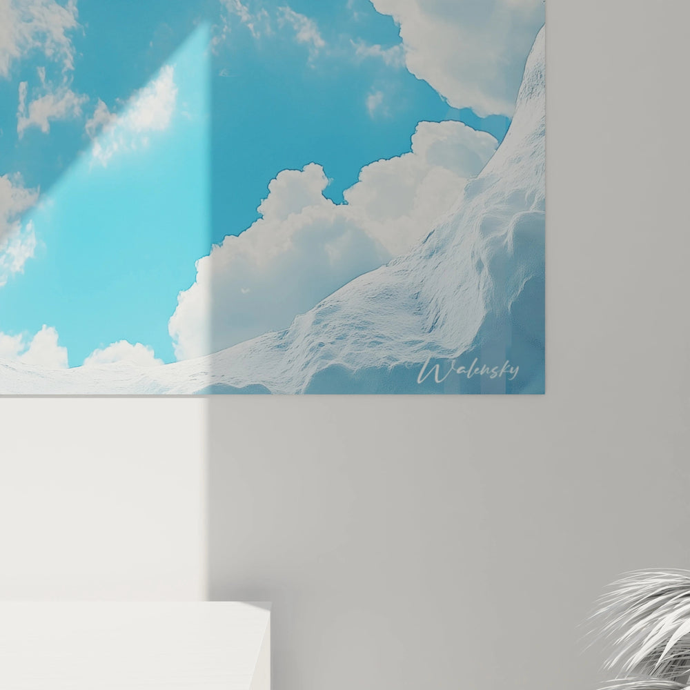 Ce tableau nuage présente une perspective saisissante depuis l'intérieur d'une formation glacée vers un ciel azur parsemé de nuages blancs. L'œuvre révèle immédiatement une ouverture circulaire parfaitement découpée, créant un effet de fenêtre naturelle vers l'infini céleste. Le tableau nuage trompe l'œil joue magistralement avec la perception de profondeur et d'espace. Les formations blanches qui encadrent l'ouverture évoquent des parois de glace sculptées par le temps, créant un contraste saisissant avec la douceur du ciel visible. Cette décoration murale nuage transforme instantanément l'espace en fenêtre vers l'évasion, offrant une échappée visuelle remarquable qui attire immédiatement le regard vers son centre lumineux.