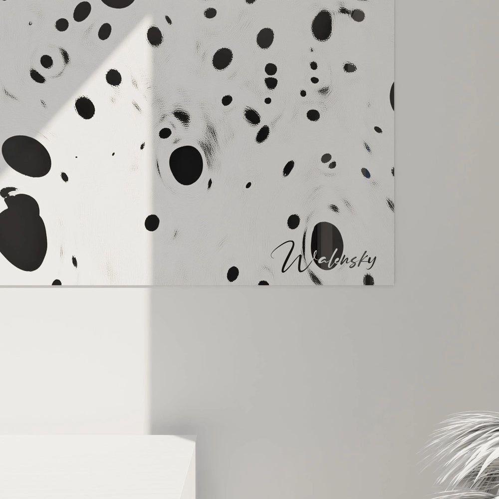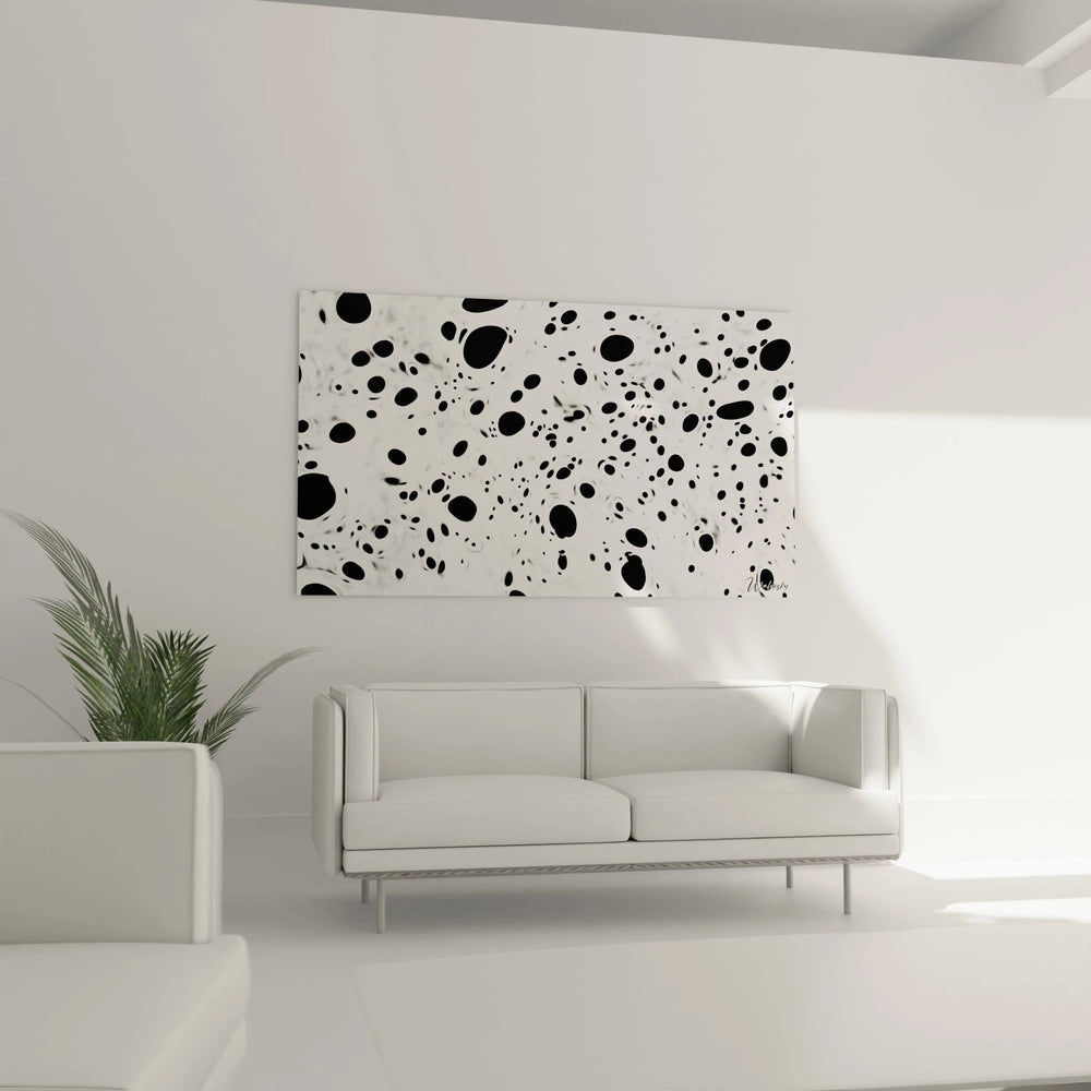 Lorsque vos yeux se posent sur ce tableau, ils découvrent un ballet délicat de tâches, harmonieuses et profondément contrastées. La pureté du noir et blanc invite votre esprit à déceler la profondeur cachée derrière cette apparente simplicité. Vous pouvez presque sentir le rythme lent et régulier des éclats de lumière, donnant vie à une composition qui évolue au gré des jeux d’ombre et de lumière de votre pièce.