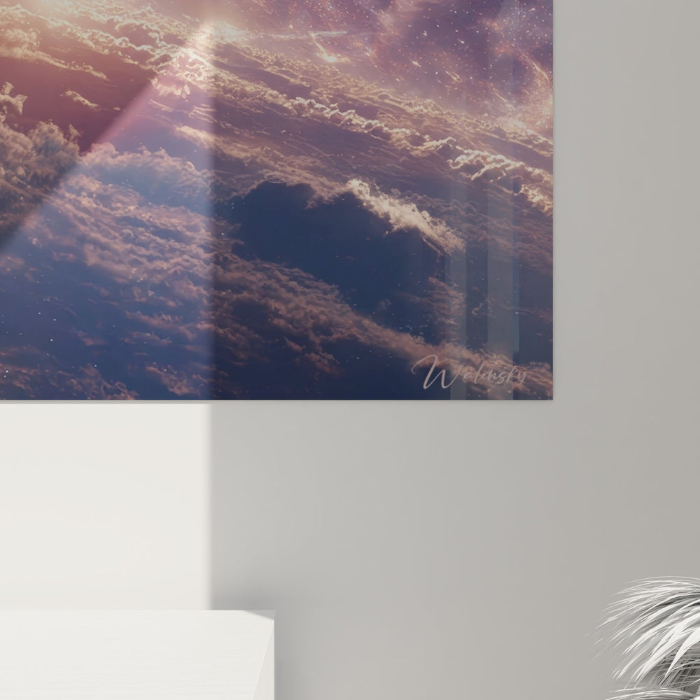 La palette chromatique de ce tableau atmosphère céleste évoque la transcendance et l'élévation spirituelle. Les tons dorés symbolisent la lumière divine et l'illumination, tandis que les nuances violettes et rosées représentent la transformation et le mystère cosmique. Cette œuvre d'art spatial décorative inspire la contemplation et invite au voyage intérieur, créant une ambiance apaisante et inspirante dans votre intérieur.