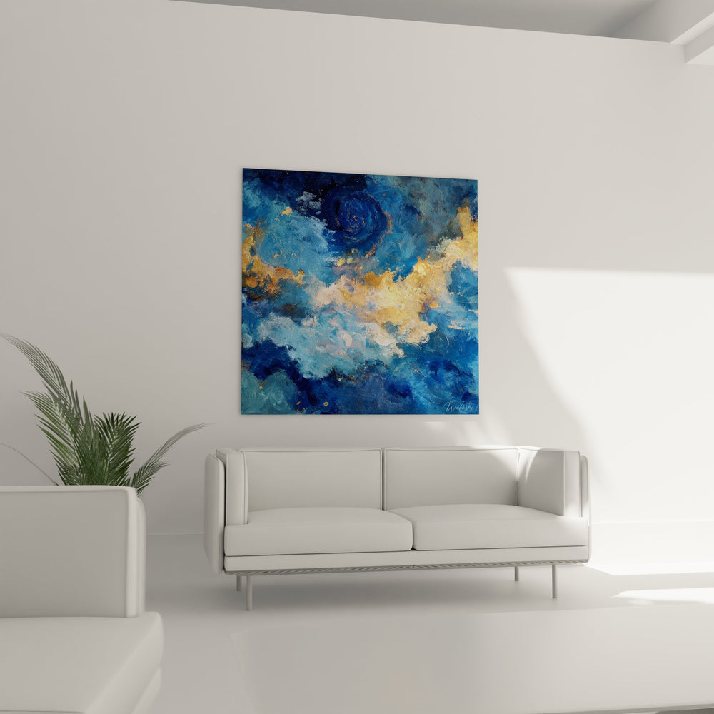 Tags : tableau nuages abstraits, art mural bleu or, peinture ciel moderne, décoration abstraite contemporaine, œuvre tempête céleste