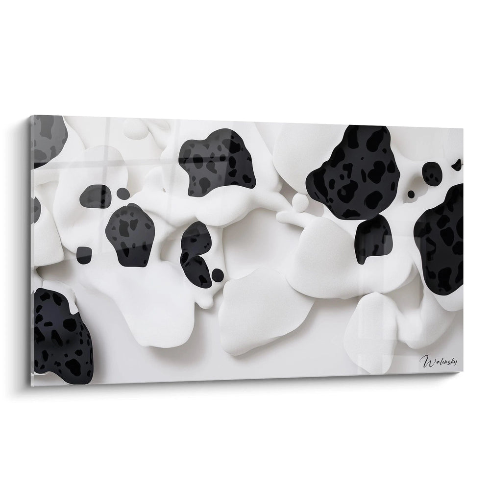 Ce tableau abstrait organique présente une composition fascinante où se mélangent formes fluides blanches et motifs tachetés noirs dans une harmonie visuelle saisissante. La première impression révèle un univers sculptural tridimensionnel où les éléments semblent flotter dans un espace indéfini, créant une sensation de mouvement perpétuel. Cette décoration murale abstraite contemporaine captive immédiatement par son contraste saisissant entre les zones immaculées et les textures ponctuées de noir. L'élément distinctif le plus frappant réside dans ces formes ondulantes qui évoquent simultanément des nuages, des galets polis par l'océan ou encore des cellules organiques en division. Les premières secondes d'observation révèlent cette capacité unique de l'œuvre à transformer la perception de l'espace environnant.