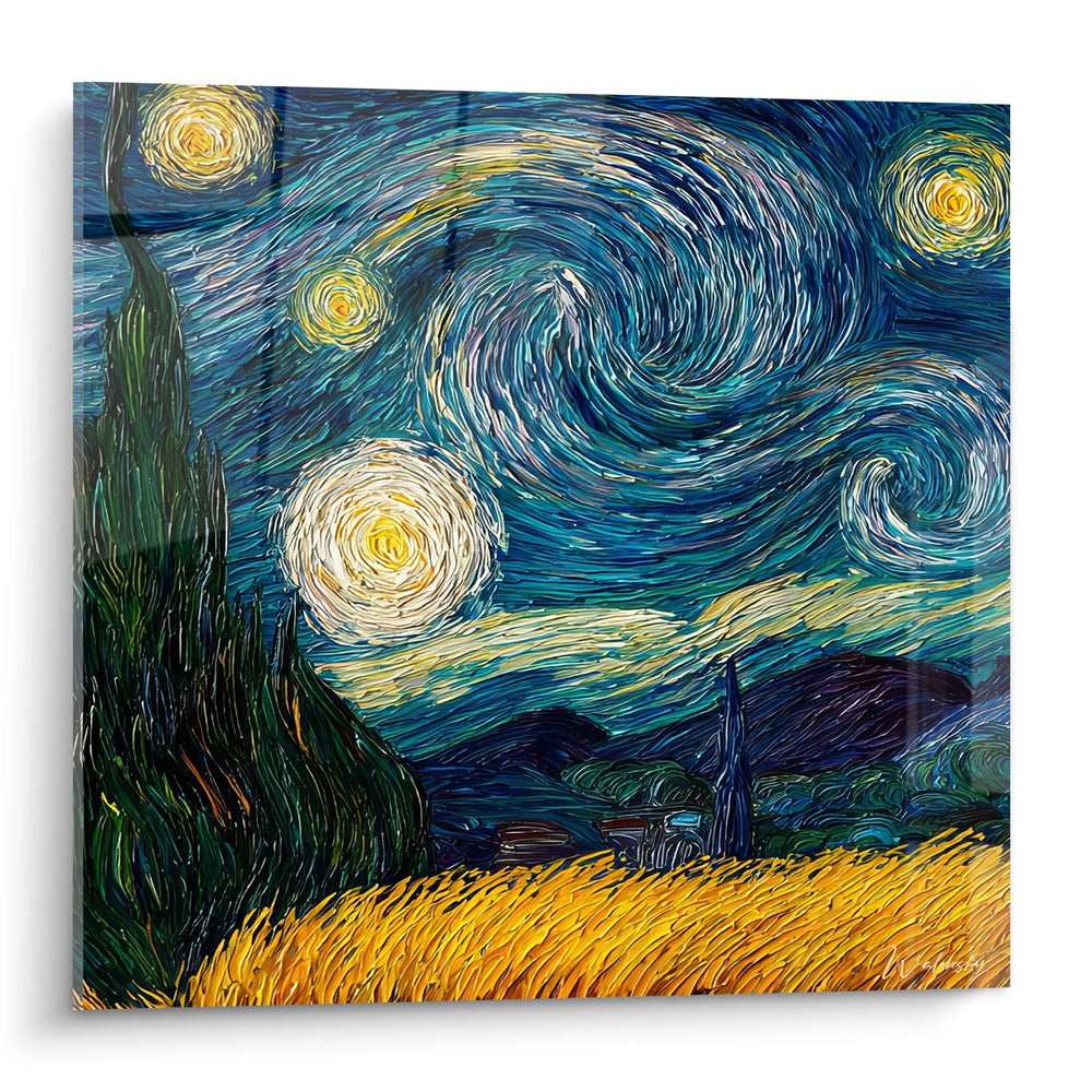 Cette œuvre s'inspire directement du mouvement post-impressionniste et fait écho aux chefs-d'œuvre de Vincent van Gogh. La technique des empâtements et les tourbillons caractéristiques rappellent l'approche expressive de l'art du XIXe siècle. L'utilisation de la couleur pure et des mouvements rythmés place cette création dans la lignée des grands maîtres qui ont révolutionné la perception du paysage nocturne. Cette interprétation moderne perpétue la tradition artistique tout en apportant sa propre sensibilité contemporaine.