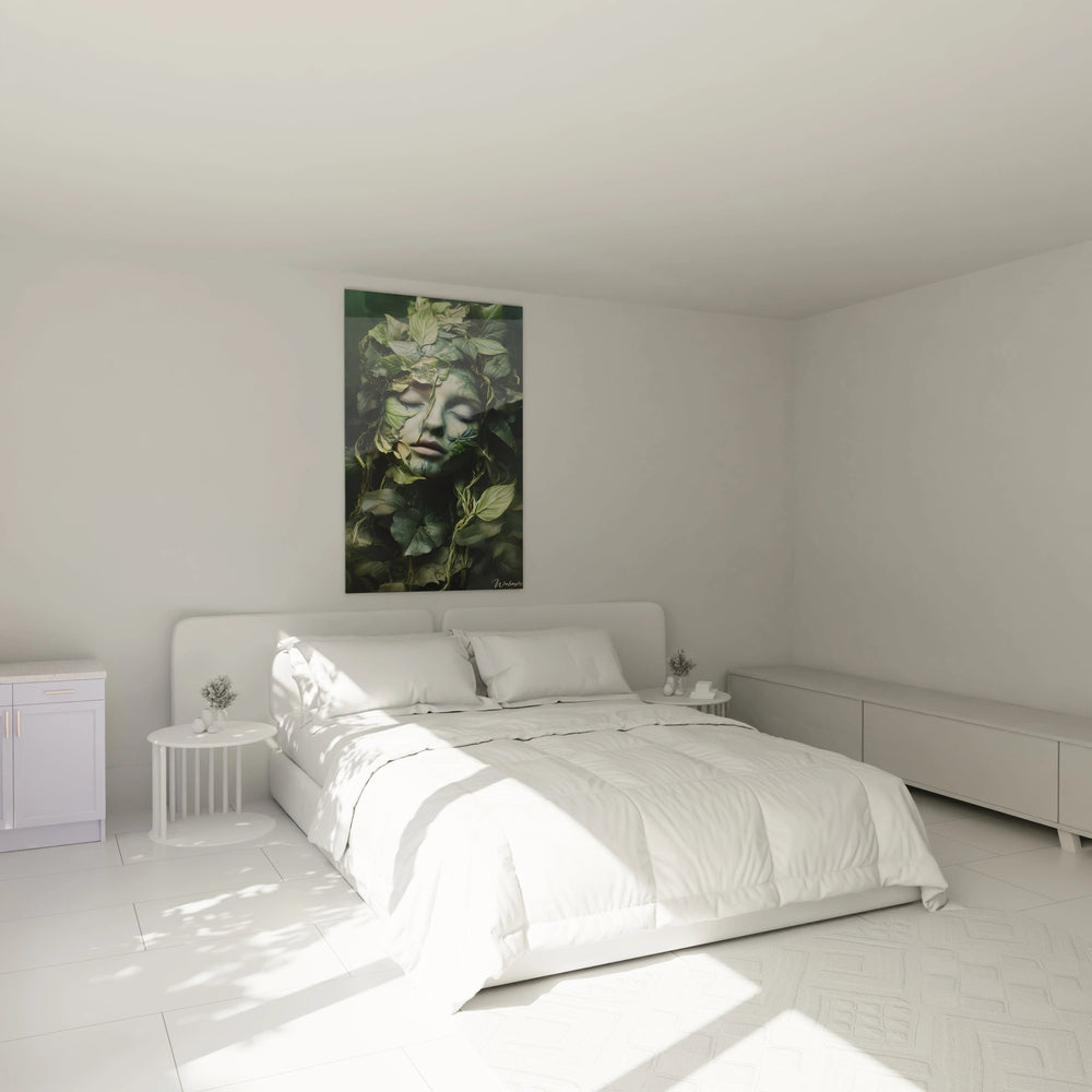 Ce tableau visage nature fascine instantanément par sa fusion saisissante entre figure humaine et éléments végétaux. L'œuvre présente un visage féminin paisible, les yeux clos, littéralement envahi par des feuilles vertes luxuriantes qui semblent émerger de sa peau. Cette création captivante évoque immédiatement les mythes de métamorphose où l'humain et le végétal s'entrelacent. La composition dégage une atmosphère mystique renforcée par un jeu d'ombre et de lumière subtil, créant une profondeur visuelle remarquable dans ce tableau visage végétal.