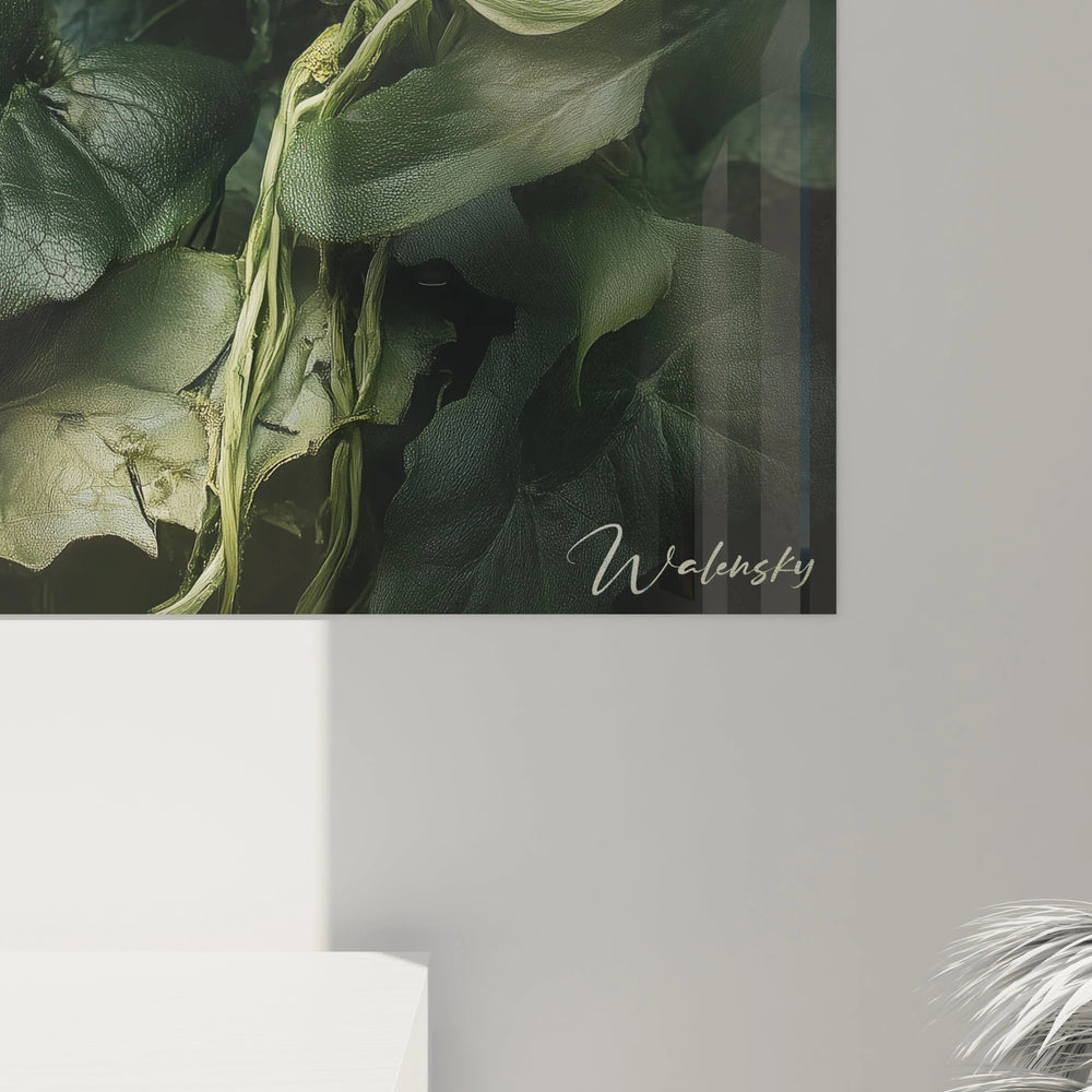 La technique employée semble combiner un travail photographique numérique avec des manipulations artistiques créant cet effet unique de fusion. Les contrastes entre les textures lisses de la peau et les surfaces plus texturées des feuilles renforcent l'impact visuel de cette décoration murale visage nature, offrant une expérience tactile même par simple observation.