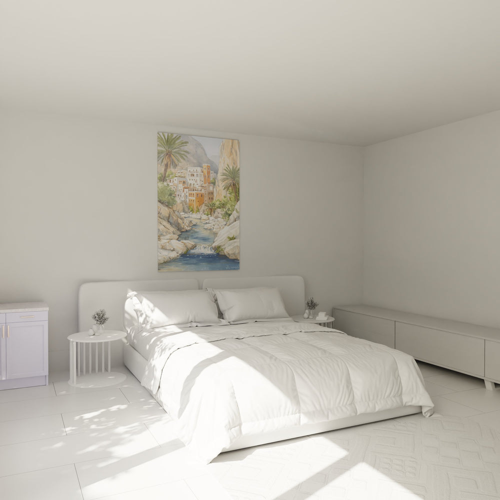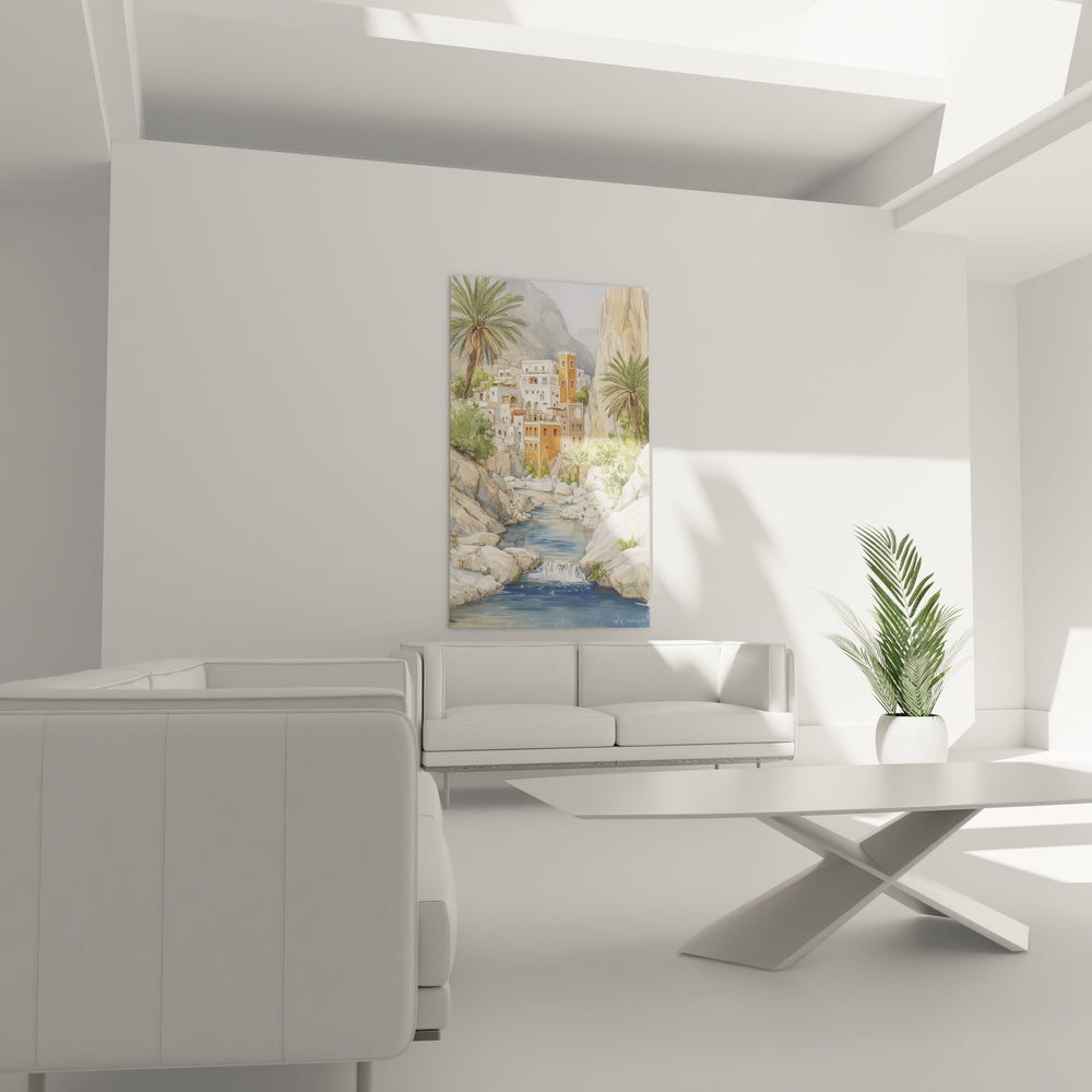 Ce magnifique tableau mural oasis présente une scène enchantée d'un village traditionnel niché dans un wadi aux palmiers. L'œuvre dépeint avec finesse un ensemble architectural harmonieux composé de maisons aux façades ocre et blanches, dominées par une tour élancée qui se dresse majestueusement contre les falaises rocheuses canyon. Les palmiers dattiers gorges encadrent la composition, leurs frondaisons vertes contrastant avec la minéralité des roches calcaires. Au premier plan, une rivière cristalline wadi serpente entre les rochers polis, créant de petites cascades qui animent la scène de leur murmure. Cette peinture village désertique capture l'essence d'un habitat traditionnel du Moyen-Orient, où l'architecture vernaculaire s'intègre parfaitement dans le paysage naturel des gorges. Les détails architecturaux, des fenêtres à meneaux aux terrasses en gradins, témoignent d'une adaptation séculaire à l'environnement aride. L'art décoratif canyon révèle la beauté des oasis cachées, véritables joyaux de verdure dans l'immensité minérale. Cette décoration murale gorges apporte une dimension poétique et exotique à tout intérieur, invitant au voyage et à la contemplation.