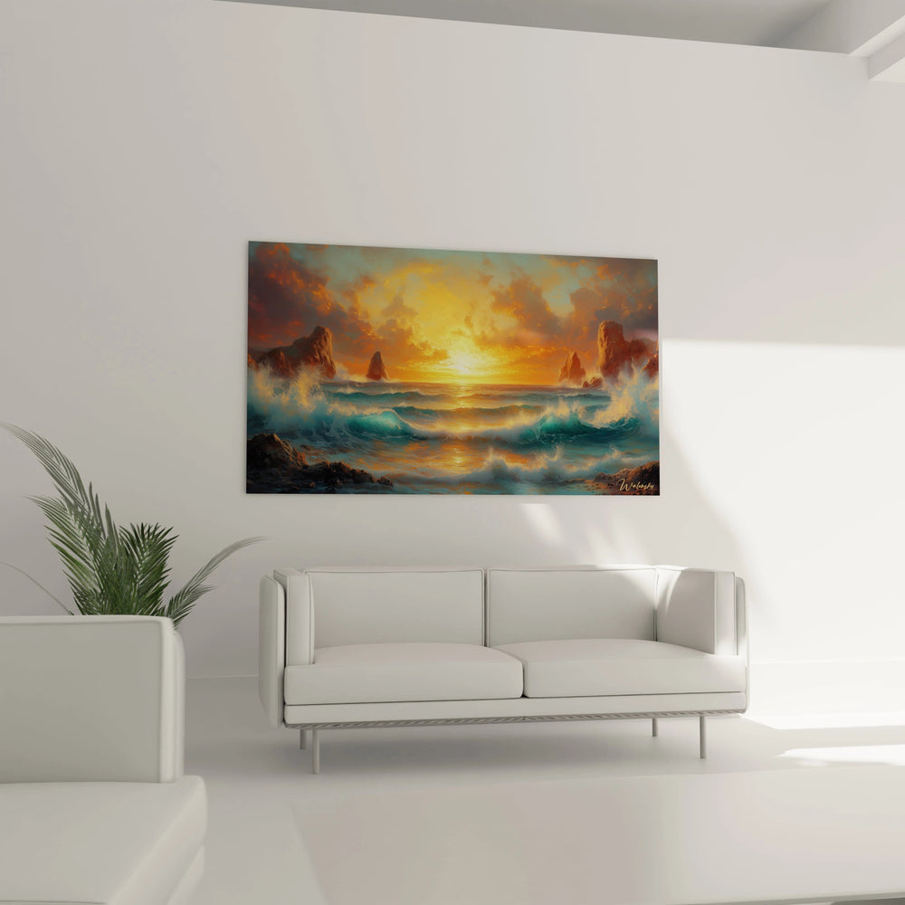 Plusieurs éléments distinguent cette décoration murale coucher de soleil des représentations conventionnelles. Les formations rocheuses présentent des silhouettes uniques qui évoquent des sentinelles naturelles gardant l'horizon. La manière dont la lumière dorée enveloppe l'ensemble de la scène crée une atmosphère presque mystique. L'art mural coucher de soleil se caractérise par ses reflets lumineux sur l'eau qui forment un chemin de lumière menant directement au soleil, créant une profondeur remarquable.