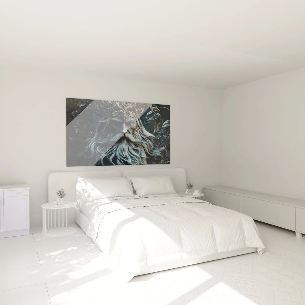 Cette création saisissante plonge au cœur des mythologies où s’entrelacent sagesse, pouvoir et mystère. Odin, figure emblématique et sage suprême, y est magnifiquement représenté : son regard intense vous captive, porteur d’une profondeur qui semble voir au-delà du réel. La barbe argentée, la couronne aux reflets dorés sculptés avec minutie, et les nuances sombres confèrent à ce portrait un caractère à la fois imposant et digne, parfait pour évoquer la grandeur des divinités et des rois légendaires.
