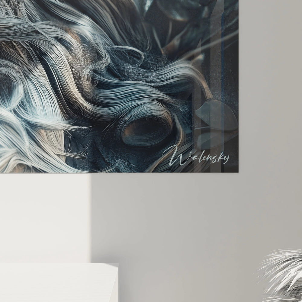 Les couleurs choisies jouent avec la lumière et l’ombre, mêlant le bleu profond, l’or éclatant et l’obscurité mystérieuse. Cette palette crée une ambiance enveloppante, subtilement envoûtante, qui invite à la contemplation et à la réflexion. Chaque trait, chaque reflet métallique inscrit dans le tableau apporte une dimension presque tangible, vous faisant sentir la texture glacée du métal et la chaleur intérieure du feu sacré des anciens récits.