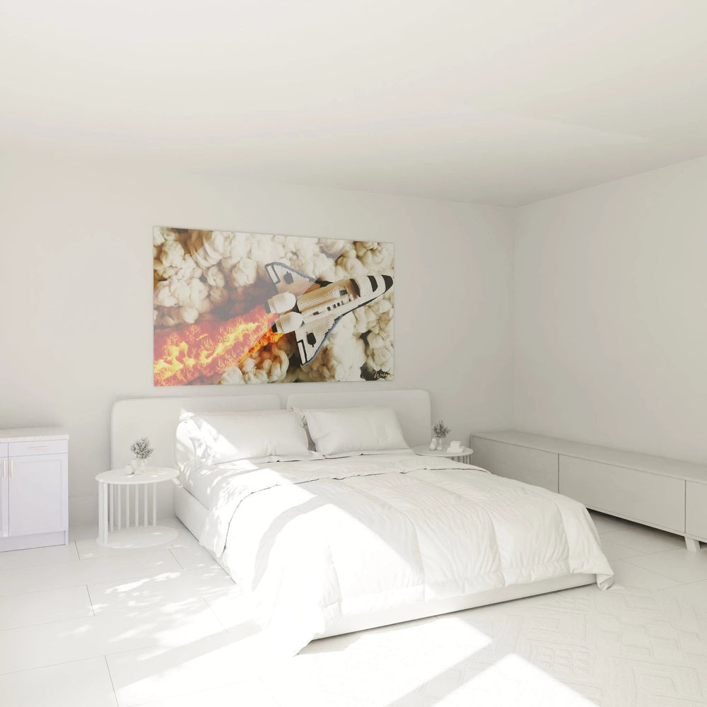 La composition de ce tableau fusée crochet technique artisanale est remarquablement équilibrée, avec la navette positionnée en diagonale ascendante, suggérant mouvement et élan. L'œuvre exploite habilement la perspective pour créer une impression de profondeur, avec la navette semblant émerger des nuages vers le spectateur. Les lignes directrices formées par les contours de la fusée guident naturellement le regard vers le haut, renforçant la sensation d'envol.