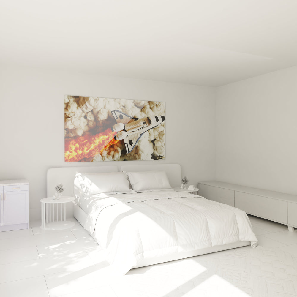 Ces teintes s'harmonisent pour créer un équilibre dynamique entre chaleur et froideur, entre mouvement et stabilité. Les nuances plus subtiles de beige dans les nuages ajoutent de la profondeur, tandis que les éclats jaunes au cœur des flammes intensifient l'effet de propulsion. Cette harmonie chromatique évoque parfaitement la dualité entre la puissance brute du décollage et la précision technologique de l'exploration spatiale.