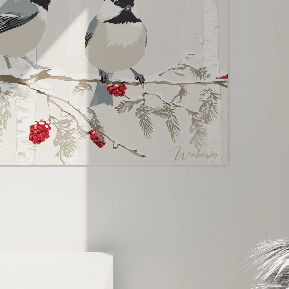 L'originalité de cette décoration murale oiseaux Noël réside dans sa capacité à fusionner nature sauvage et tradition festive sans artifice. La présence simultanée des baies sauvages rouges et des boules de Noël crée une continuité chromatique ingénieuse. Les mésanges, représentées dans une posture naturelle, semblent parfaitement intégrées à cet univers décoré. L'effet de neige omniprésent unifie tous les éléments et apporte une cohérence visuelle exceptionnelle. Cette œuvre oiseaux décorative transcende la simple représentation animalière pour devenir une véritable célébration de l'hiver et des fêtes, créant une atmosphère unique impossible à reproduire.
