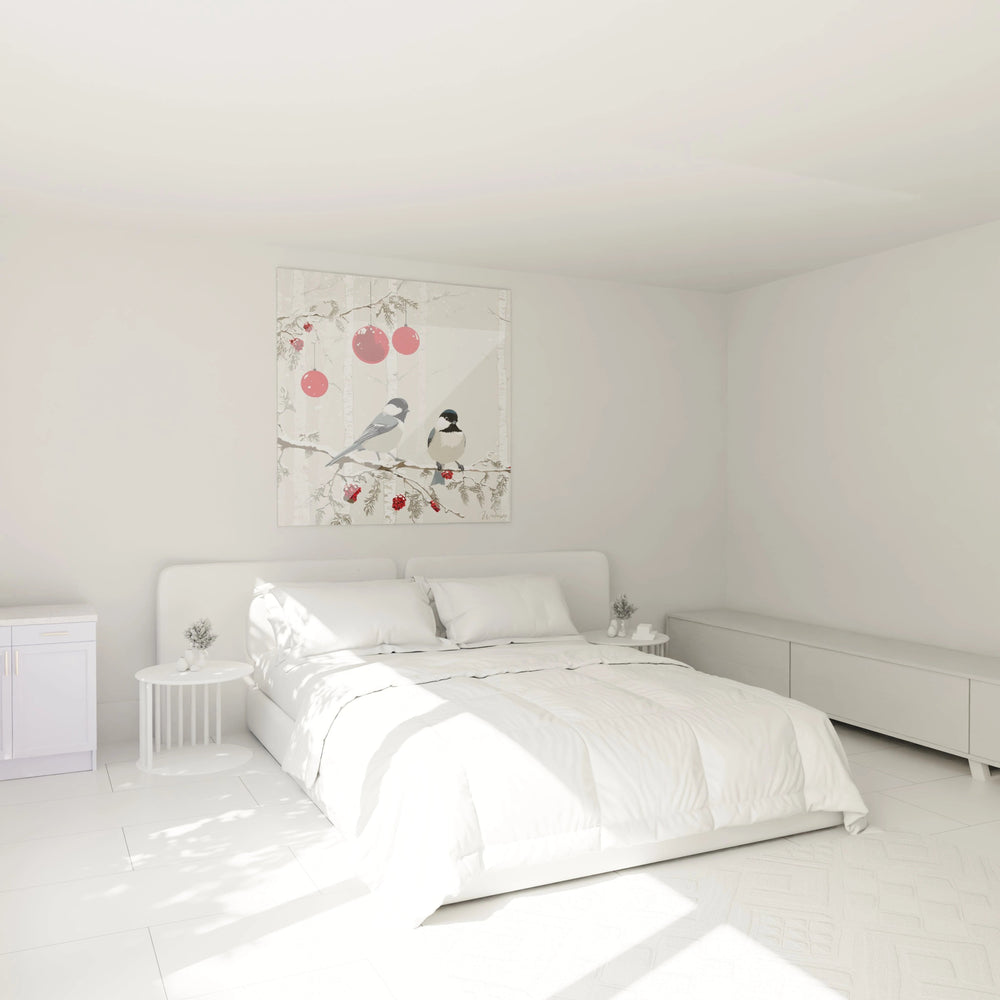 La composition de ce tableau oiseaux branches enneigées révèle un équilibre parfaitement maîtrisé. Les deux oiseaux occupent le centre de l'œuvre, positionnés sur une branche horizontale qui divise naturellement l'espace. Les troncs de bouleaux blancs créent des lignes verticales qui structurent la composition et guident le regard vers les sujets principaux. Les boules de Noël rouges, suspendues à différentes hauteurs, forment un triangle visuel qui dynamise l'ensemble. Cette œuvre oiseaux hiver utilise la règle des tiers avec subtilité, plaçant les éléments clés aux points d'intersection pour créer une harmonie visuelle naturelle.