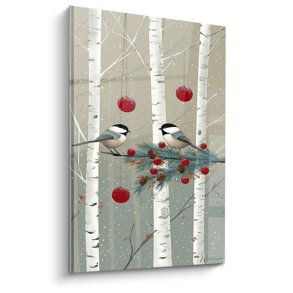 Ce tableau oiseaux hiver révèle une scène d'une délicatesse saisissante où deux mésanges aux plumages contrastés se perchent gracieusement sur une branche ornée de décorations festives. L'œuvre capture l'essence même de la saison froide avec ses bouleaux aux écorces blanches striées de noir, créant un décor naturel d'exception. Les flocons de neige dansent délicatement dans l'atmosphère gris-beige, conférant à ce tableau oiseaux neige une poésie visuelle remarquable. Les oiseaux, aux têtes noires brillantes et aux ventres blanc crème, incarnent la vitalité au cœur de l'hiver, tandis que leurs plumages gris-bleu apportent une note de couleur subtile mais essentielle à la composition.