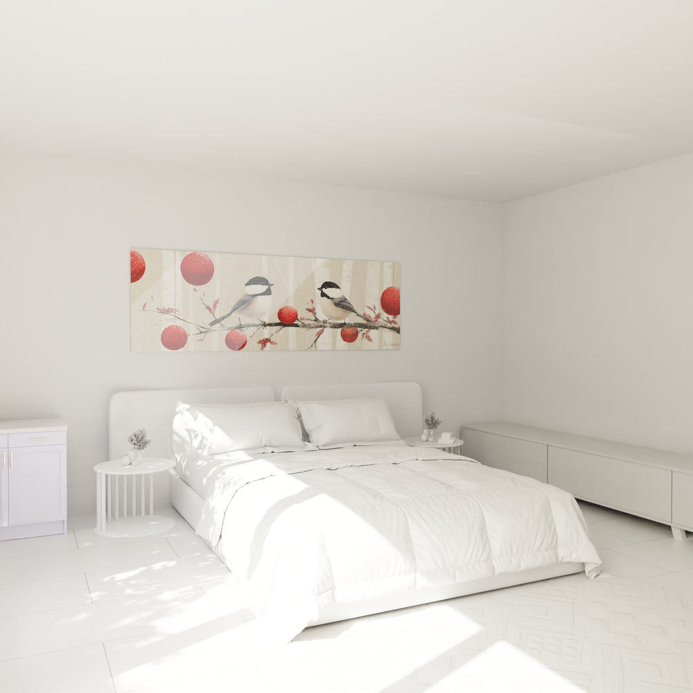 Cette harmonie chromatique crée une ambiance à la fois festive et apaisante. Le rouge, couleur de Noël par excellence, apporte une dimension célébrative, tandis que les tons neutres maintiennent une élégance intemporelle. Cette art mural oiseaux démontre une maîtrise parfaite de l'équilibre coloriste.