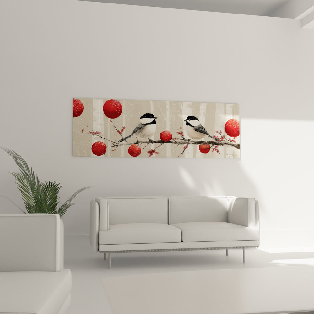 Ce tableau oiseaux présente deux mésanges à tête noire perchées sur une branche, créant une scène hivernale d'une délicatesse remarquable. L'œuvre frappe immédiatement par ses boules rouges ornementales qui ponctuent la composition, évoquant l'esprit festif dans un cadre naturel. Le tableau oiseaux hiver révèle un équilibre parfait entre réalisme et stylisation, où chaque détail contribue à une atmosphère chaleureuse malgré le contexte hivernal. Les deux oiseaux, positionnés en miroir, créent une dynamique visuelle captivante qui attire le regard vers le centre de l'œuvre. La neige qui tombe délicatement ajoute une dimension poétique à cette décoration murale oiseaux exceptionnelle.
