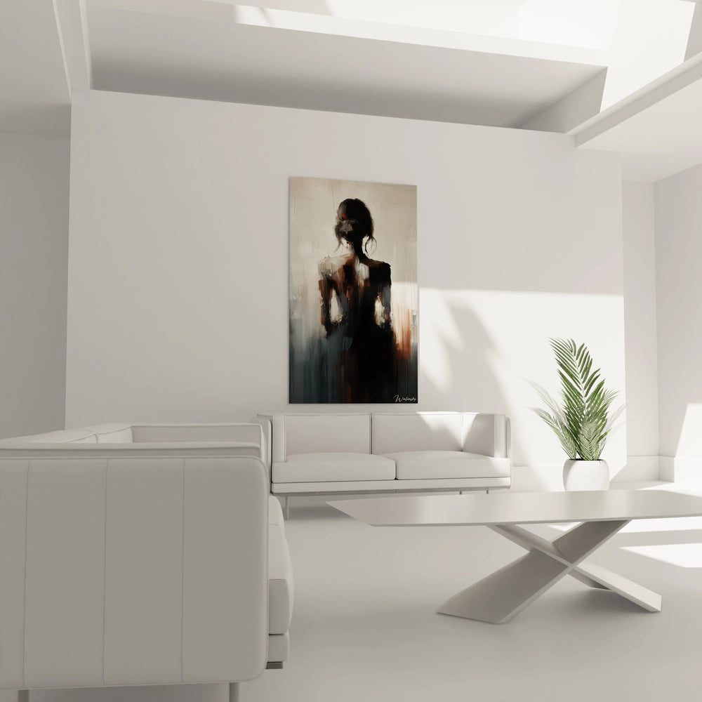 Imaginé pour capturer la dualité de l’être, ce tableau évoque la douce mélancolie d’un moment suspendu, celui où l’identité se floute et laisse place à la réflexion intime. La silhouette de dos, volontairement vague et éthérée, vous construit un espace où chaque regard peut s’égarer, interpréter, et ressentir. L’absence de contours net crée une fluidité qui rappelle la fragilité de l’existence, cette beauté secrète nichée dans l’inconnu.