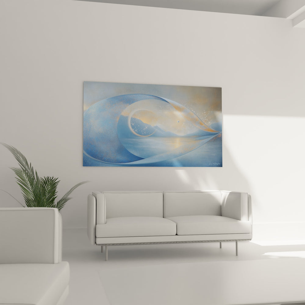 La palette chromatique bleue dominante évoque la sérénité, l'infini et la profondeur spirituelle. Les tons dorés parsemés symbolisent l'illumination et la transformation intérieure. Cette composition abstraite fluide représente le mouvement perpétuel de l'énergie universelle, créant une atmosphère méditative parfaite pour les espaces de détente et de réflexion.