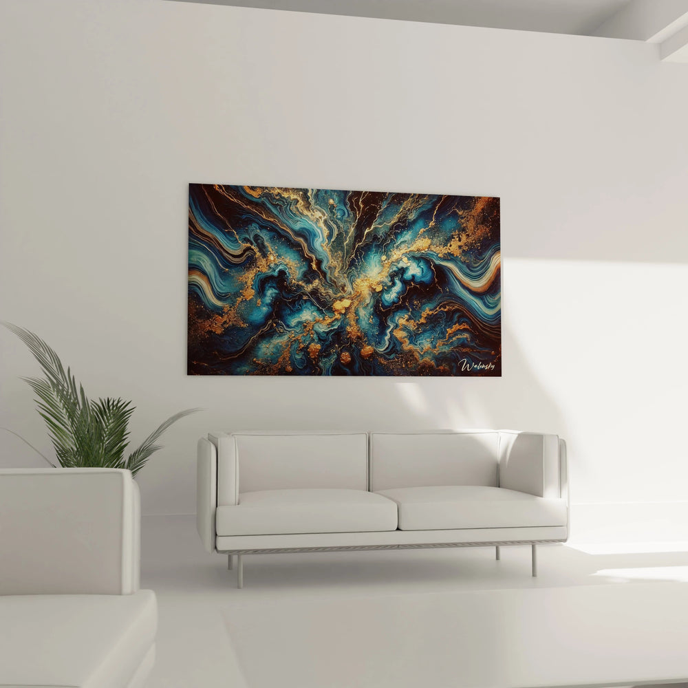 Chaque détail évoque les ondes énergétiques et le souffle créateur des galaxies naissantes. L’or lumineux ponctue la toile, semblable à des poussières d’étoiles scintillantes - un équilibre parfait entre calme et énergie vibrante, capable d’éveiller émotions et rêveries.