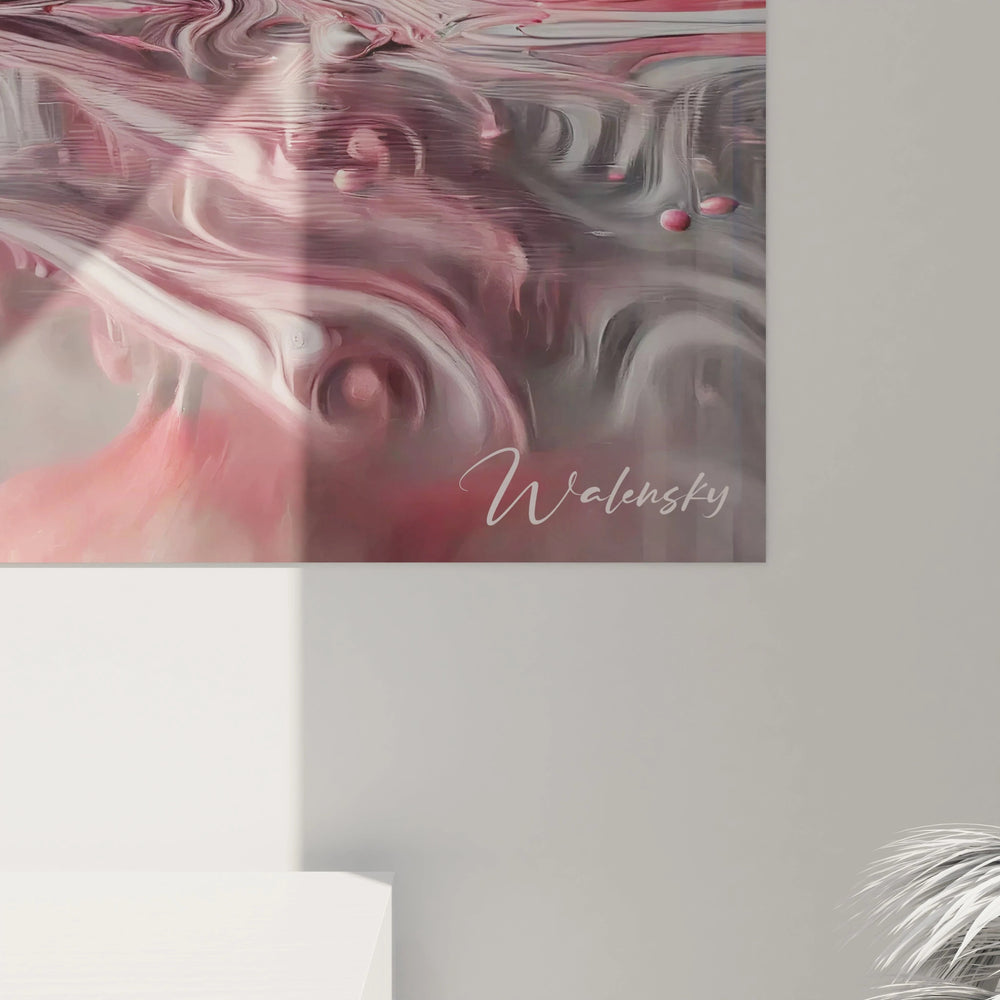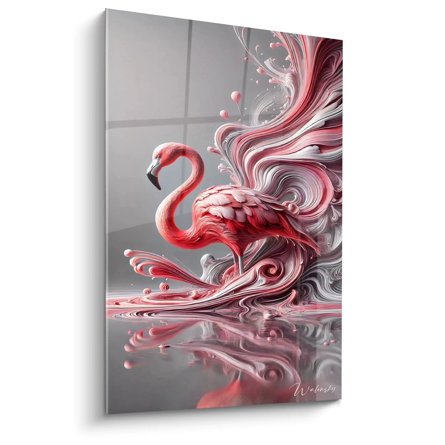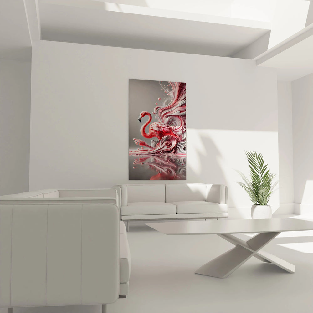 Chaque détail de ce tableau respire l’élégance. Le flamant rose, majestueux dans sa posture sinueuse, semble danser sur le rythme des ondes qui l’enlacent. Les teintes poudrées de rose se mêlent à des reflets argentés et gris subtils, créant une symphonie visuelle à la fois douce et dynamique. Vous sentez presque la fraîcheur de l'eau et le souffle léger du vent porter cette scène apaisante.