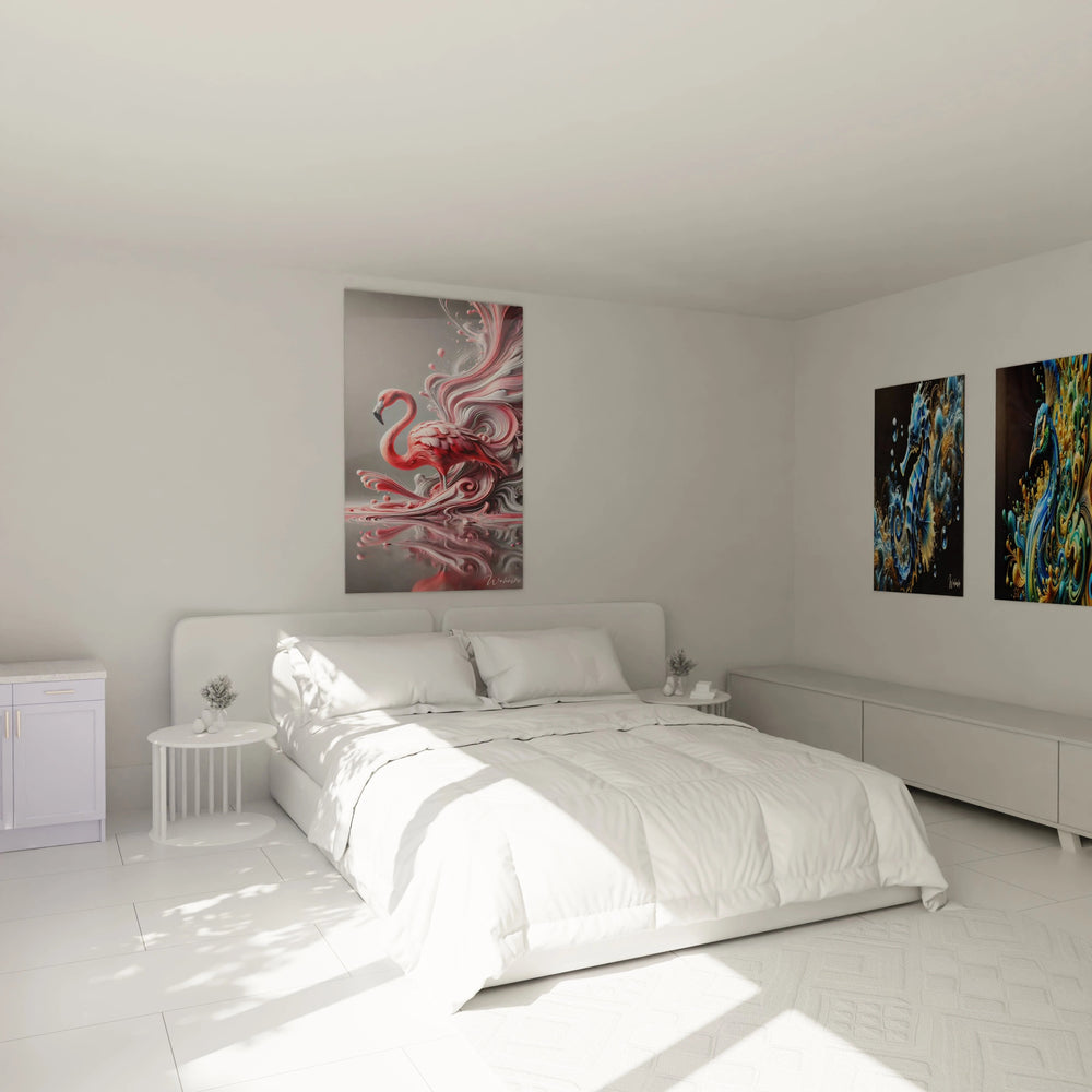 Le Tableau Ondes Rosées puise son inspiration dans le symbolisme de la nature et le mouvement perpétuel de la vie. Le flamant rose représente la délicatesse et la résilience, évoluant avec fluidité dans son milieu aquatique. Les lignes abstraites qui l'entourent évoquent la transformation, la liberté, et l’harmonie cachée dans chaque instant.