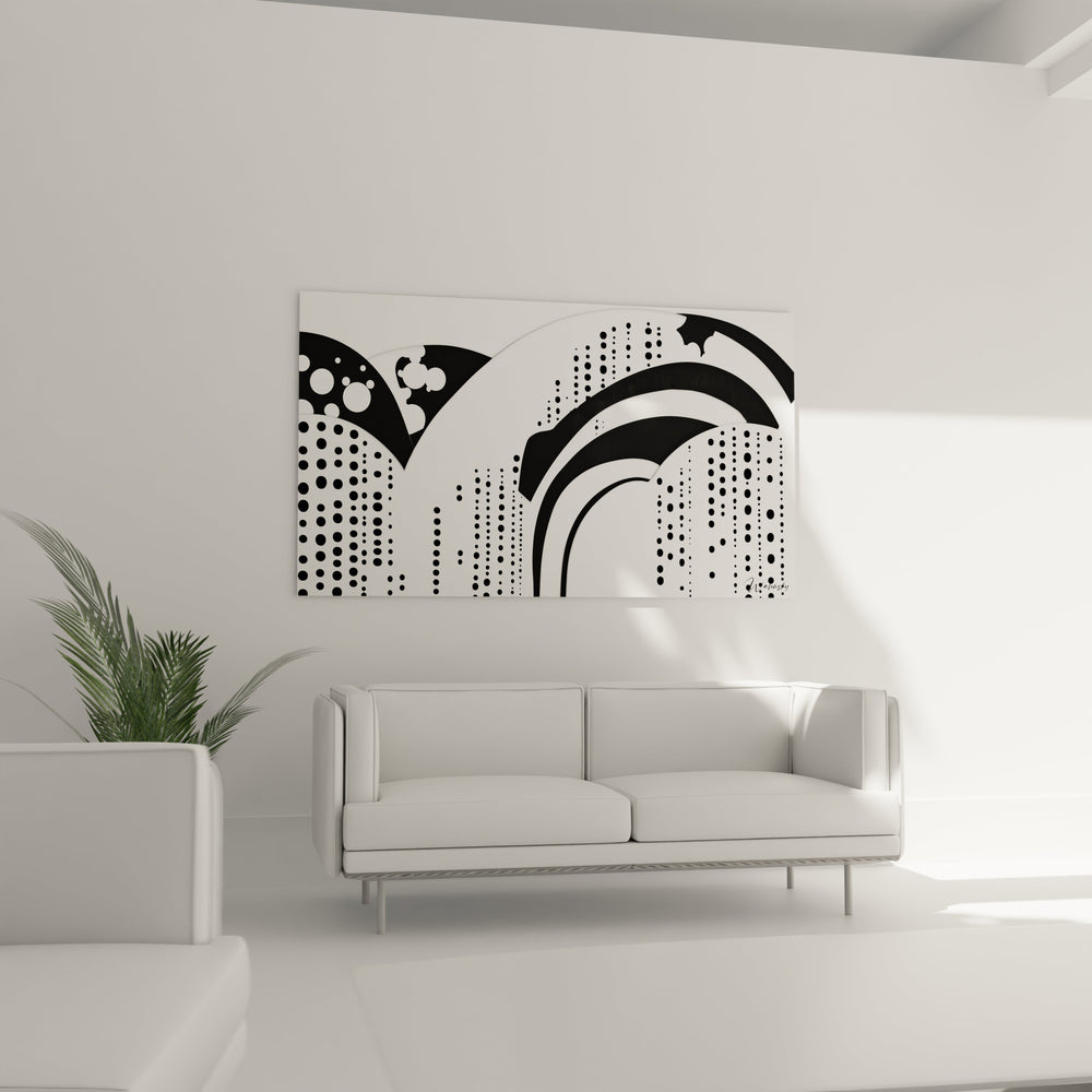 Les ondulations délicates, accentuées par un jeu de points tachetés, évoquent le flux apaisant des éléments naturels, comme une danse hypnotique qui attire le regard et apaise l’esprit. Le noir profond contrastant sur un fond blanc immaculé crée une dynamique visuelle élégante et contemporaine, apportant à votre espace une sensation de légèreté et de profondeur à la fois.