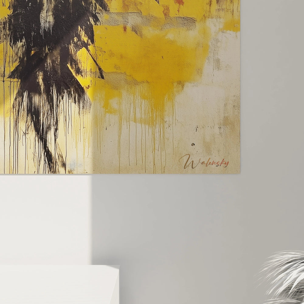 Vue de loin, l'œuvre frappe par sa composition audacieuse et son contraste chromatique puissant, la silhouette noire se détachant clairement sur le fond jaune dans une impression globale d'énergie rayonnante. En s'approchant, le spectateur découvre progressivement la richesse des détails texturelamourls qui animent la surface : craquelures fines dans la couche picturale, éclaboussures délicates, superpositions de matières créant des effets de transparence et de profondeur.