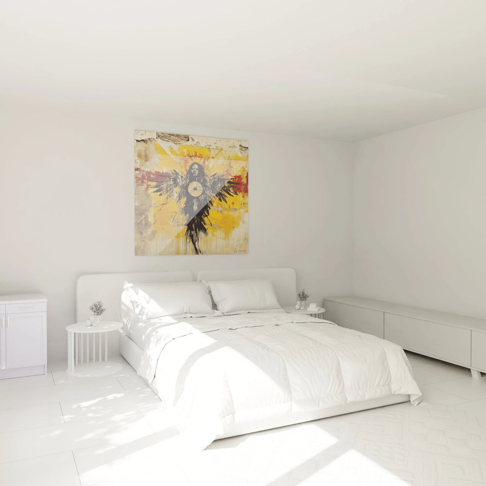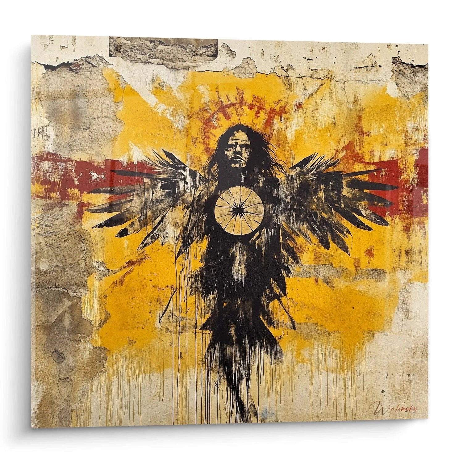 Les ailes ou extensions qui jaillissent des bras de la figure créent une silhouette unique, mi-humaine mi-oiseau, qui évoque les représentations traditionnelles de chamanes en transe. La décision artistique de laisser la figure partiellement abstraite, sans détails faciaux précis, renforce son caractère universel et mystérieux, permettant au spectateur d'y projeter sa propre interprétation spirituelle.