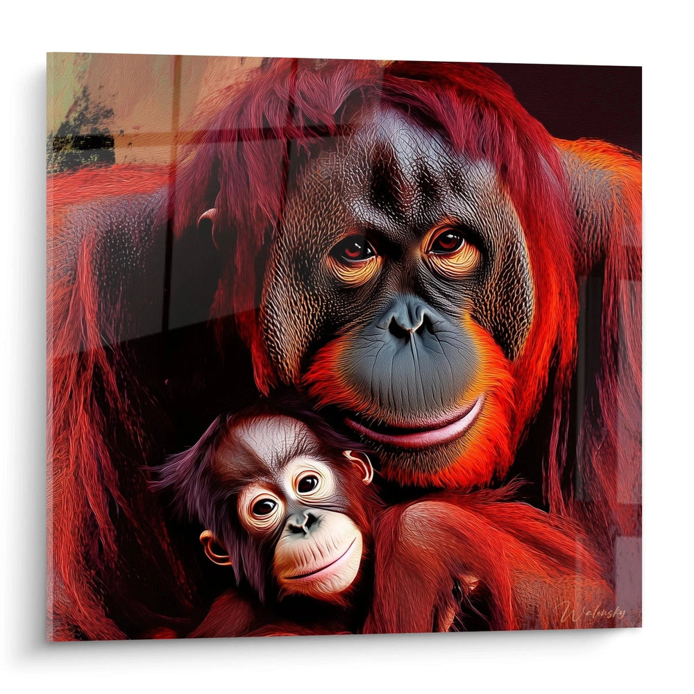 Ce tableau orang-outan présente une scène émouvante d'une mère orang-outan protégeant tendrement son petit. L'œuvre capture l'essence de la maternité avec des tons flamboyants de rouge et d'orange qui dominent la composition. Le tableau orang-outan maternel révèle une profondeur émotionnelle saisissante à travers le regard protecteur de la mère. Les détails minutieux du pelage créent une texture d'une richesse exceptionnelle, tandis que l'expression faciale du petit évoque une innocence touchante. Cette décoration murale orang-outan transforme instantanément l'atmosphère d'un espace grâce à sa présence magnétique et sa charge émotionnelle intense.