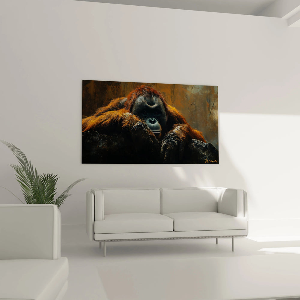 La composition dramatique, avec les mains massives et puissantes encadrant partiellement le visage, crée une mise en scène unique qui suggère la réflexion et l'introspection. Cette posture caractéristique, associée au traitement magistral des textures et des contrastes lumineux, fait de ce tableau orang-outan de Bornéo une œuvre d'art mural exceptionnelle qui captive et émeut, rappelant la dignité et la conscience de ces grands primates menacés.
