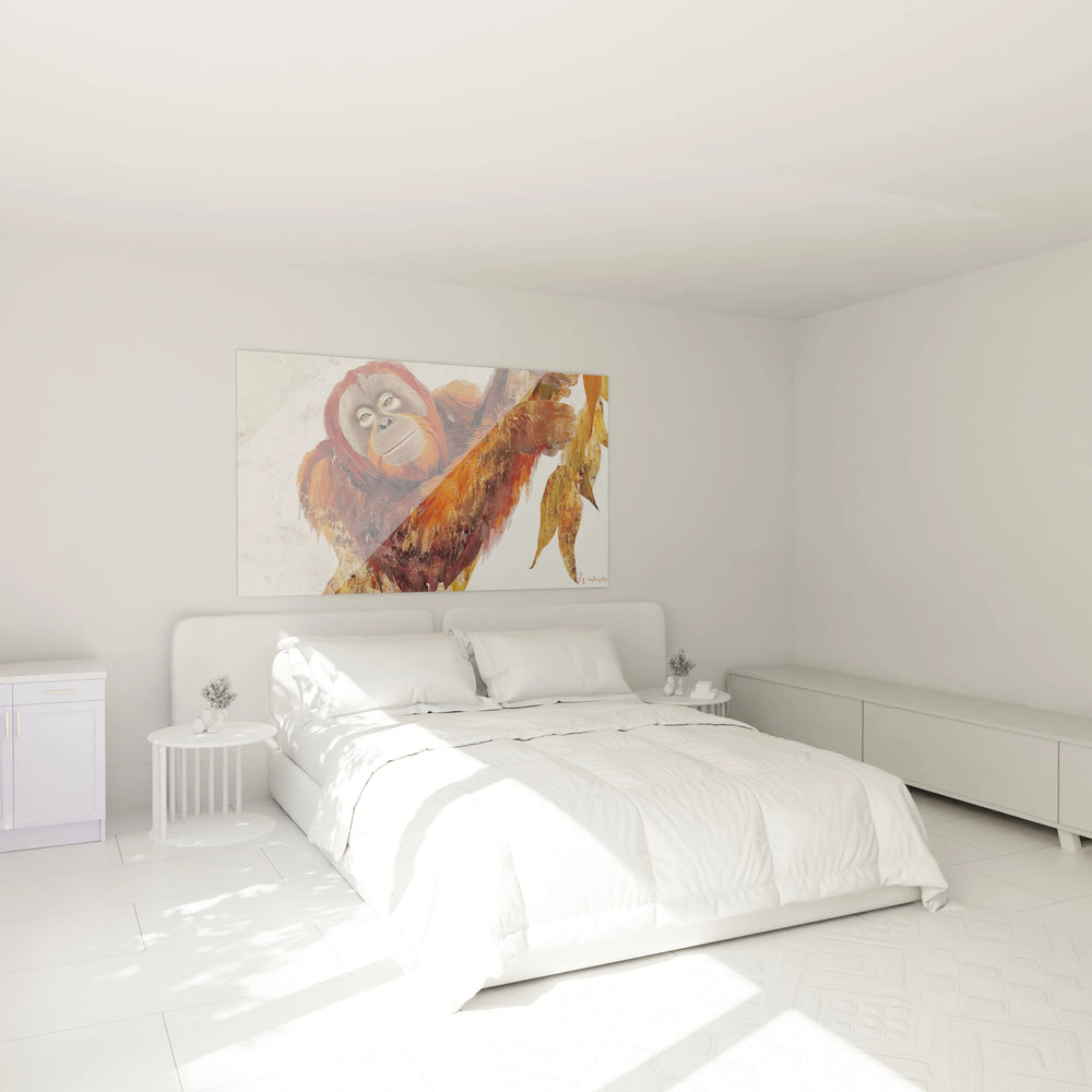 Issu de l’inspiration née lors d’un voyage en Indonésie, ce tableau sublime la grâce et la sagesse ancestrale de l’orang-outan. Suspendu dans son habitat naturel, l’animal vous offre un instant suspendu hors du temps, où chaque nuance de roux et de brun évoque la richesse sauvage de la forêt tropicale. Sa posture détendue et son regard franc racontent une histoire profonde : celle d’un équilibre fragile menacé, invitant à la préservation de notre planète.