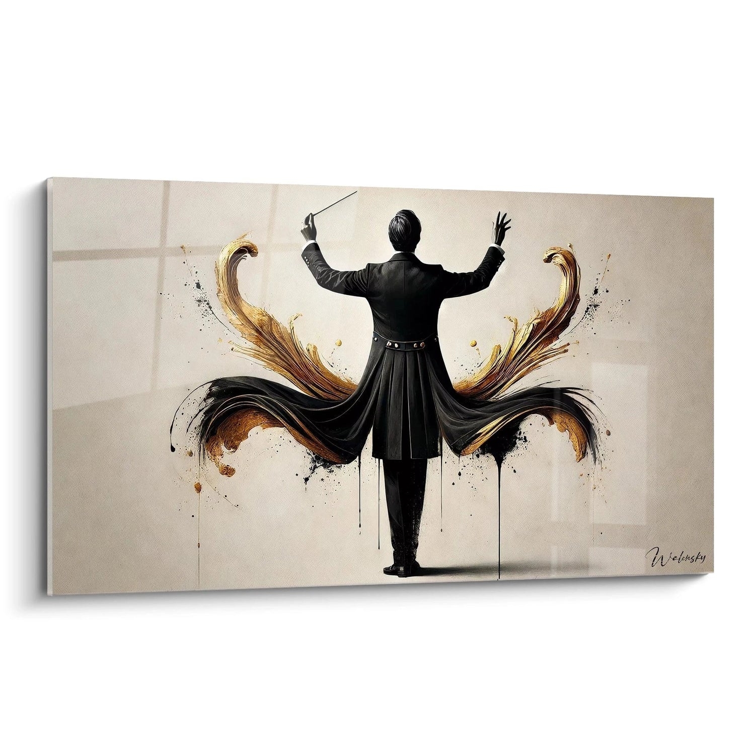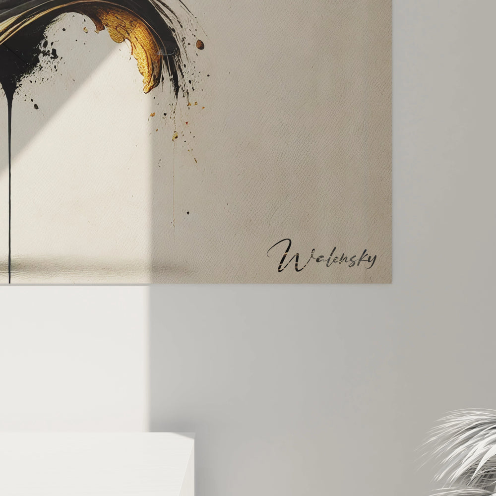 Les teintes d’or intense, de noir profond et de beige délicat s’entrelacent pour créer une profondeur visuelle remarquable. Cette harmonie chromatique évoque la richesse émotionnelle et la finesse des symphonies, tandis que les textures variées donnent vie à une composition vibrante et sophistiquée. Vous ressentirez la tension dramatique et le calme exquis de cette pièce à chaque regard, comme si la musique elle-même s’échappait de la toile.