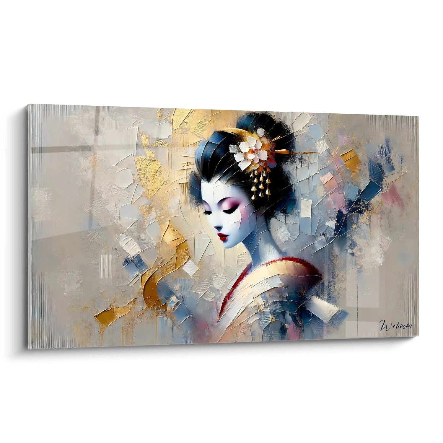 Chaque détail de ce tableau reflète la passion pour l’art traditionnel et contemporain, fusionnant finesse et modernité. Il raconte l’histoire de la geisha, à la fois gardienne d’un raffinement ancestral et symbole d’une beauté secrète et profonde. De nombreux collectionneurs ont salué cette œuvre unique, la décrivant comme “une oasis de paix visuelle” et “un trésor qui enrichit chaque pièce où il repose”.