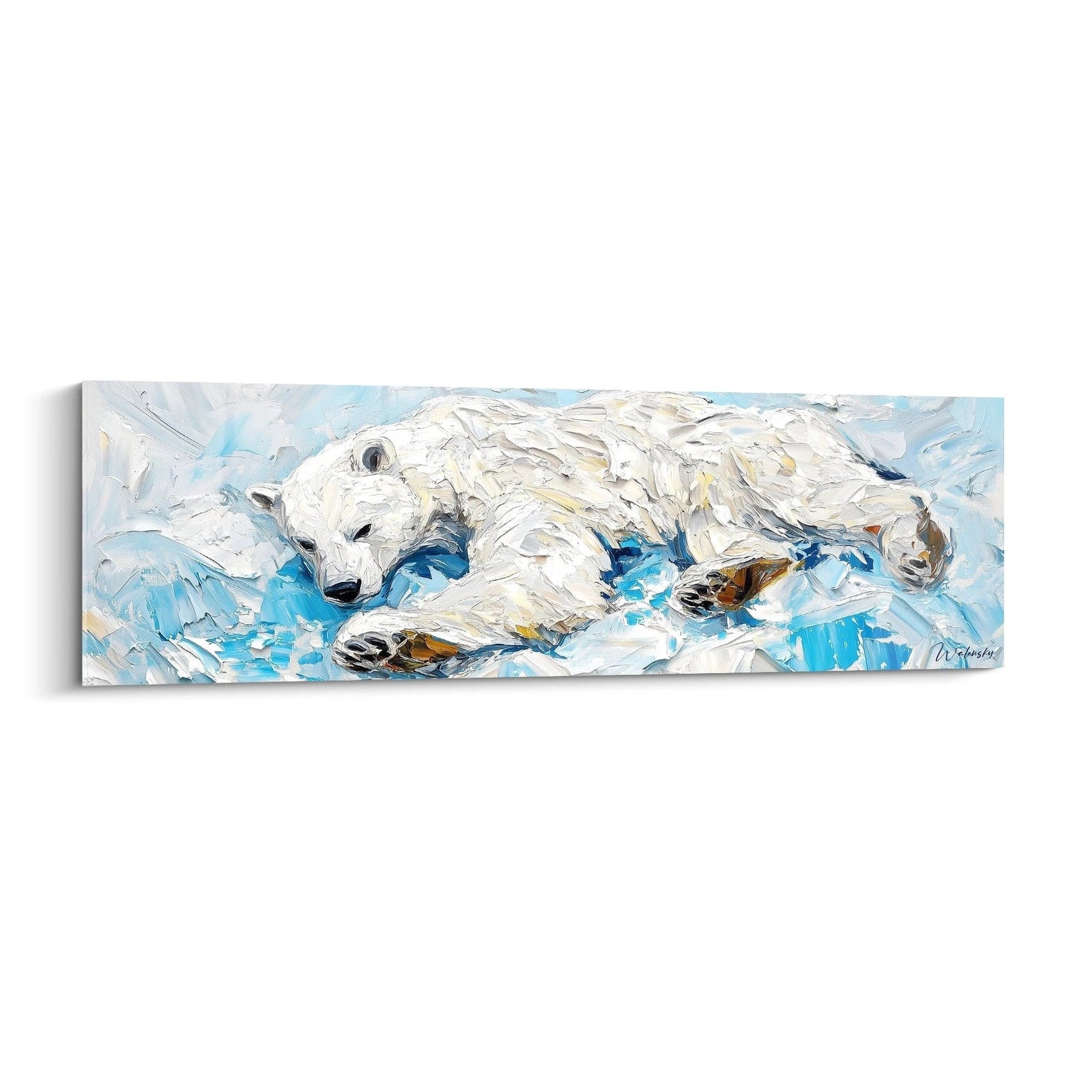 Ce tableau ours polaire captive immédiatement par sa représentation saisissante d'un majestueux ours blanc évoluant dans son habitat naturel aquatique. L'œuvre déploie une technique picturale expressive qui transforme ce tableau ours polaire nageant en véritable fenêtre sur l'Arctique. La première impression révèle un animal puissant aux formes généreuses, dont la fourrure blanche contraste magnifiquement avec les tons azurés de l'eau. Cette décoration murale ours polaire transmet une émotion profonde à travers ses empâtements visibles et sa gestuelle artistique libre. L'artiste a su capturer l'essence même de cet animal emblématique dans un format panoramique qui amplifie la sensation d'immersion. Chaque coup de pinceau contribue à créer une atmosphère authentique et poétique.