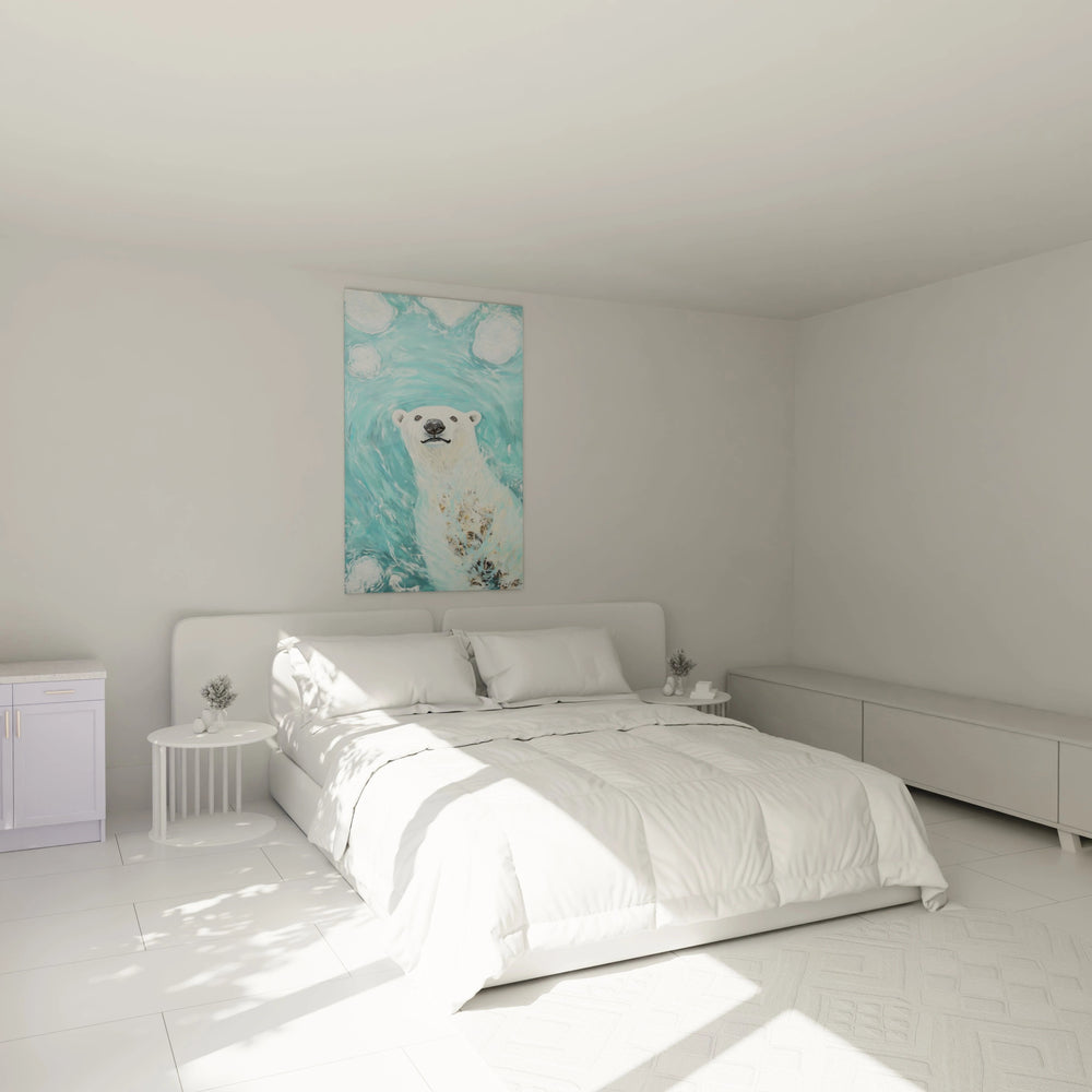 Chaque détail du tableau est pensé pour refléter la noblesse et la force de l’ours polaire, symbole d’une nature pure et sauvage. La composition harmonieuse et les nuances douces dominées par le blanc éclatant évoquent une sensation de calme profond et d’élégance discrète. La présence imposante de l’animal transforme votre mur en un véritable manifeste de caractère et de sérénité.