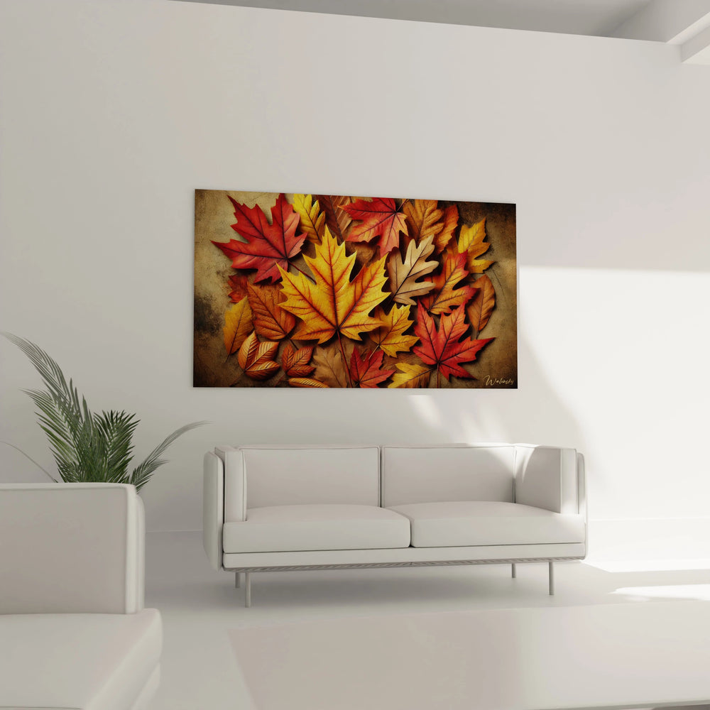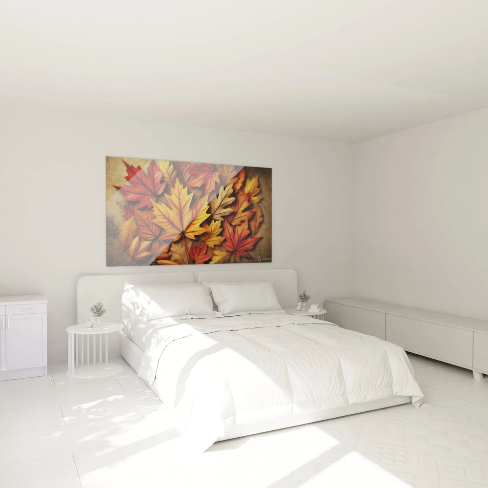 Chaque détail de ce tableau raconte une balade dans un sous-bois éclatant, où les feuilles, tombées et entremêlées sur le sol, composent une véritable mosaïque naturelle. Vous pouvez presque sentir sous vos doigts la texture délicate et craquante des feuilles, tandis que les couleurs vibrantes éveillent vos sens et réchauffent votre regard. C’est une invitation à ralentir, à prendre un moment pour vous reconnecter à la douceur d’un temps suspendu.