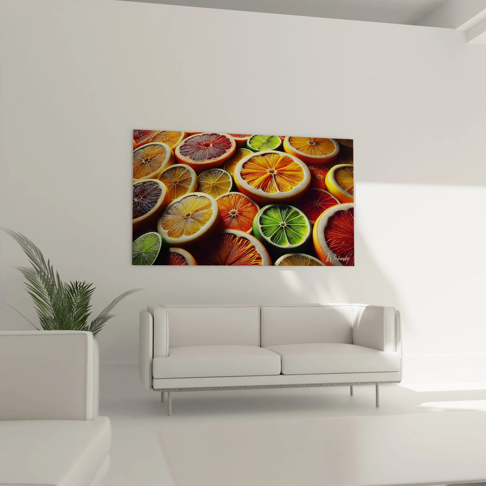 Les nuances vibrantes de jaune solaire, vert éclatant et orange chaleureux se mêlent pour créer un effet lumineux presque magique. Les textures délicates et la transparence des segments vous donnent l’impression que la fraîcheur acidulée des agrumes pourrait s’échapper du cadre pour venir parfumer votre cuisine. Cette palette colorée, pleine de vie, s’intègre parfaitement aux intérieurs modernes où la lumière et la nature se rencontrent.