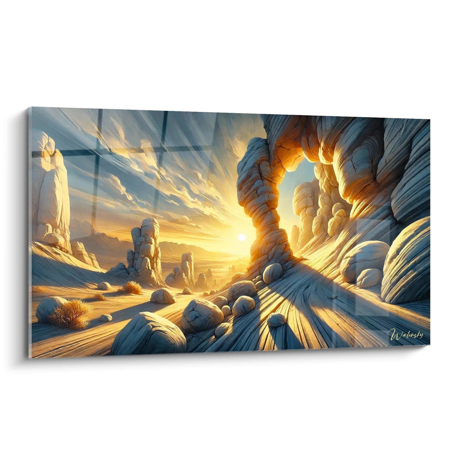Ce tableau est bien plus qu’une simple représentation : c’est une véritable porte ouverte vers un monde où le temps suspend son cours. Les rayons orangés et jaunes enveloppent la scène d’une aura chaleureuse, offrant une sensation apaisante qui invite à la contemplation. Vous ressentez presque la douceur de la brise du désert, la texture rugueuse des roches et la quiétude de ce moment suspendu, propice à l'évasion intérieure.