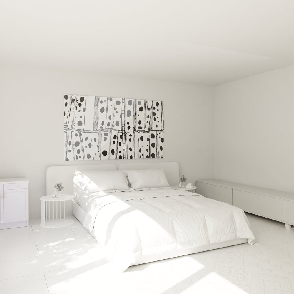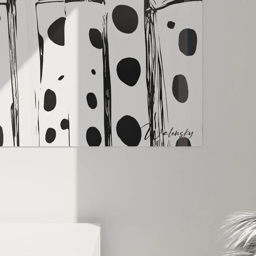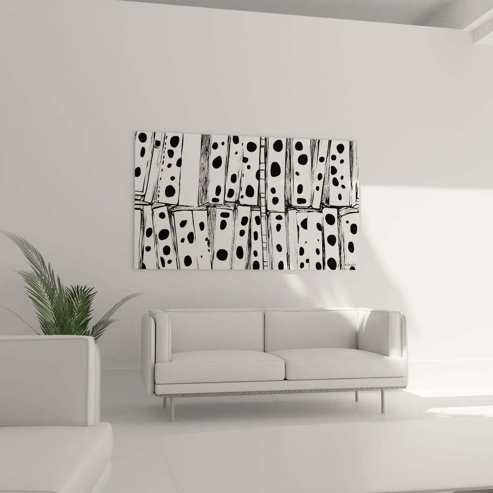 Ce tableau bambous se distingue par sa composition verticale saisissante qui évoque immédiatement l'univers des bambouseraies stylisées. L'œuvre présente une série de colonnes élancées ornées de taches circulaires noires de tailles variées, créant un rythme visuel hypnotique sur fond blanc immaculé. Cette décoration murale bambous abstraits capte instantanément l'attention par son contraste marqué et sa géométrie organique. Les éléments verticaux s'élèvent avec une régularité imparfaite, rappelant la croissance naturelle des tiges de bambous dans leur environnement forestier. La disposition des taches noires suit une logique intuitive qui évoque les nœuds caractéristiques des bambous véritables, transformés ici en motifs décoratifs contemporains.